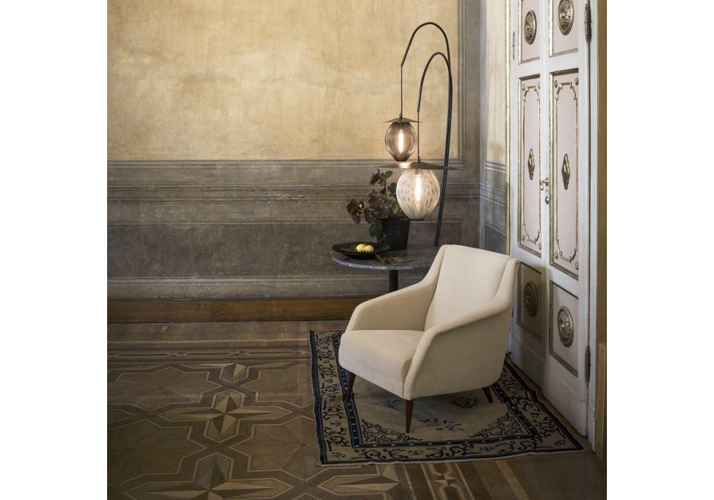 Cdc.1 von Carlo De Carli für Gubi entworfen, ist ein Loungesessel mit Stoff- oder Lederbezug und Holzbeinen.