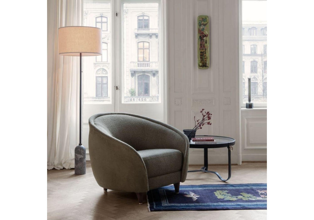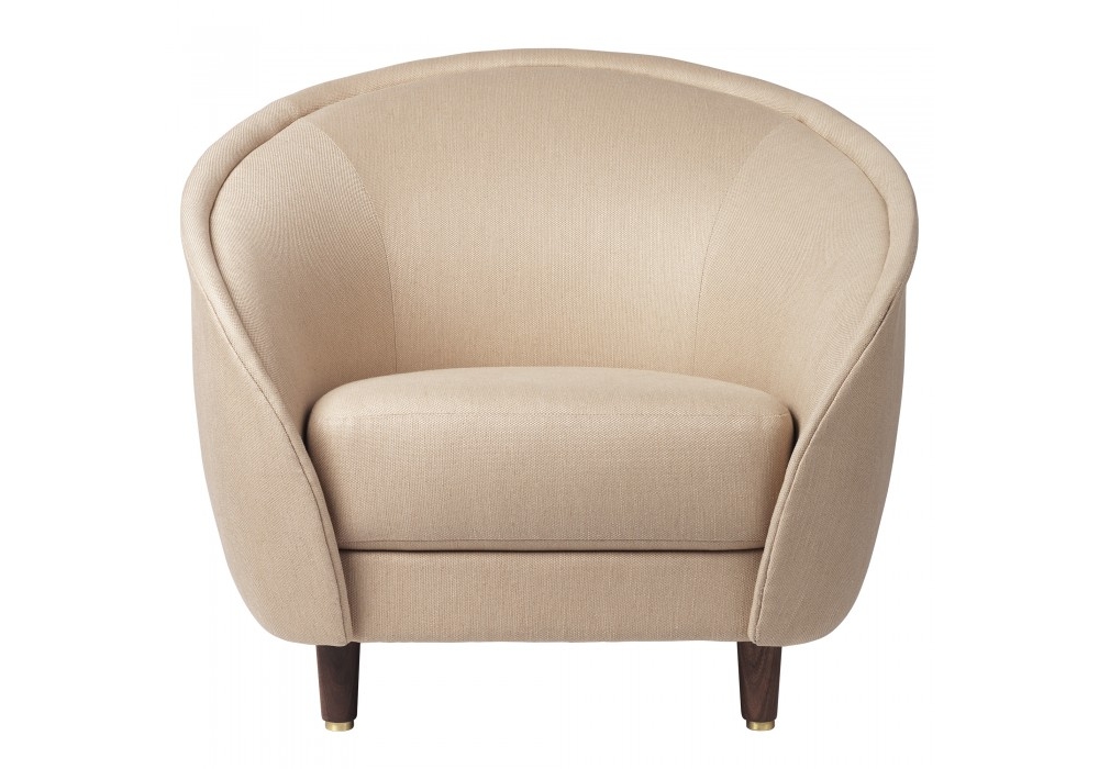 Revers von Gubi entworfen, ist ein Loungesessel bestehend aus Stoff oder Leder komplett gefütterter Korpus und Holzgestell.
