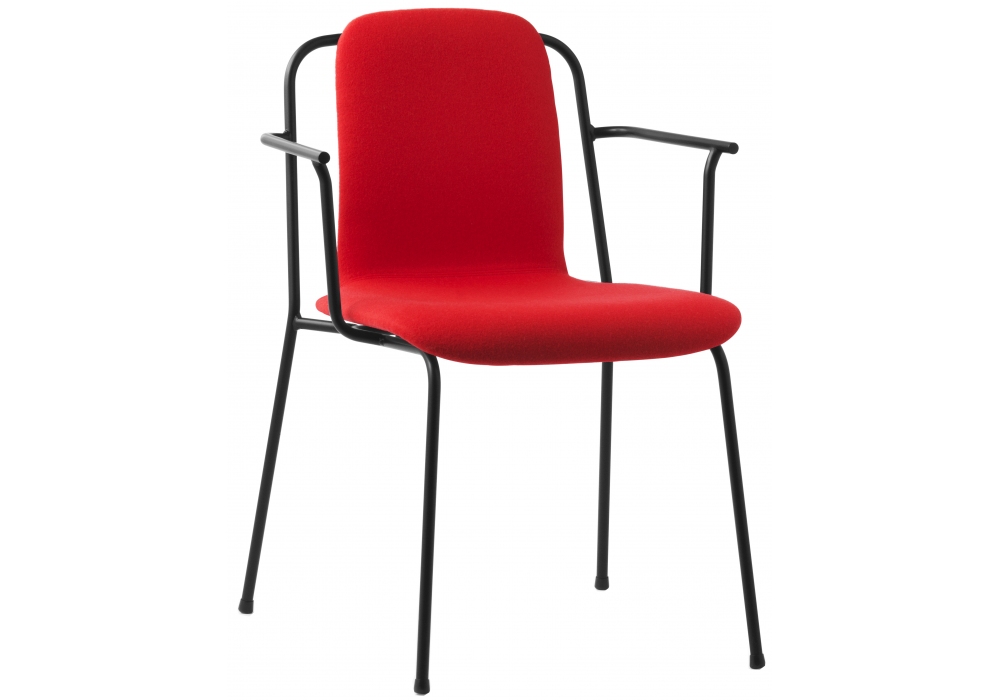Studio, entworfen von Nicholai Wiig Hansen für Normann Copenhagen, ist ein Sessel mit Holzschale, der vollständig mit Leder oder Stoff in verschiedenen Ausführungen bezogen ist. Die tragende Struktur besteht aus pulverlackiertem Stahlrohr in einer einzigen schwarzen Farbe.