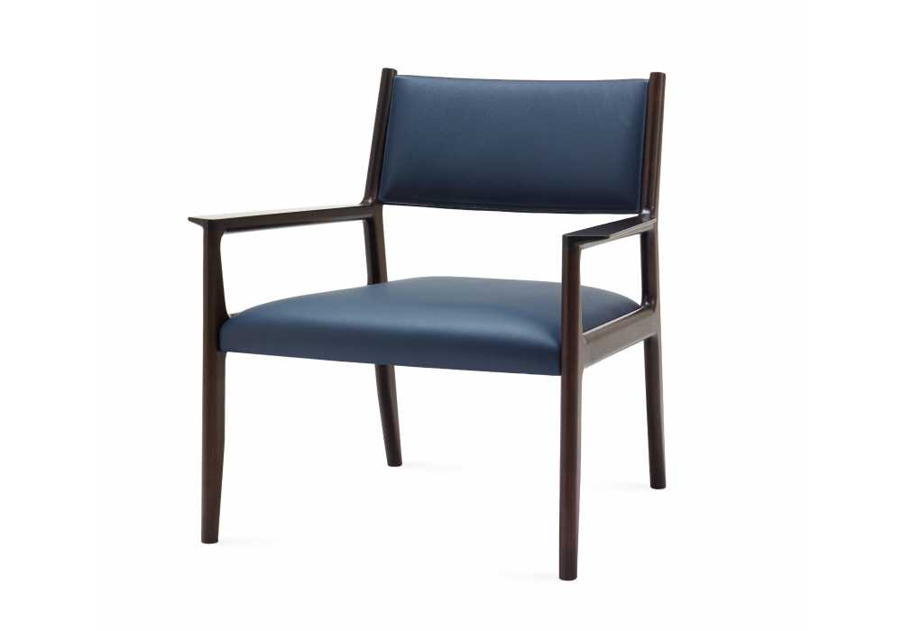 Lisa von Draw Studio für Ceccotti Collezioni entworfen, ist ein kleiner Sessel mit Nussbaum- oder Eschenstruktur und mit Stoff oder Leder bezogener Rückenlehne und Sitz.