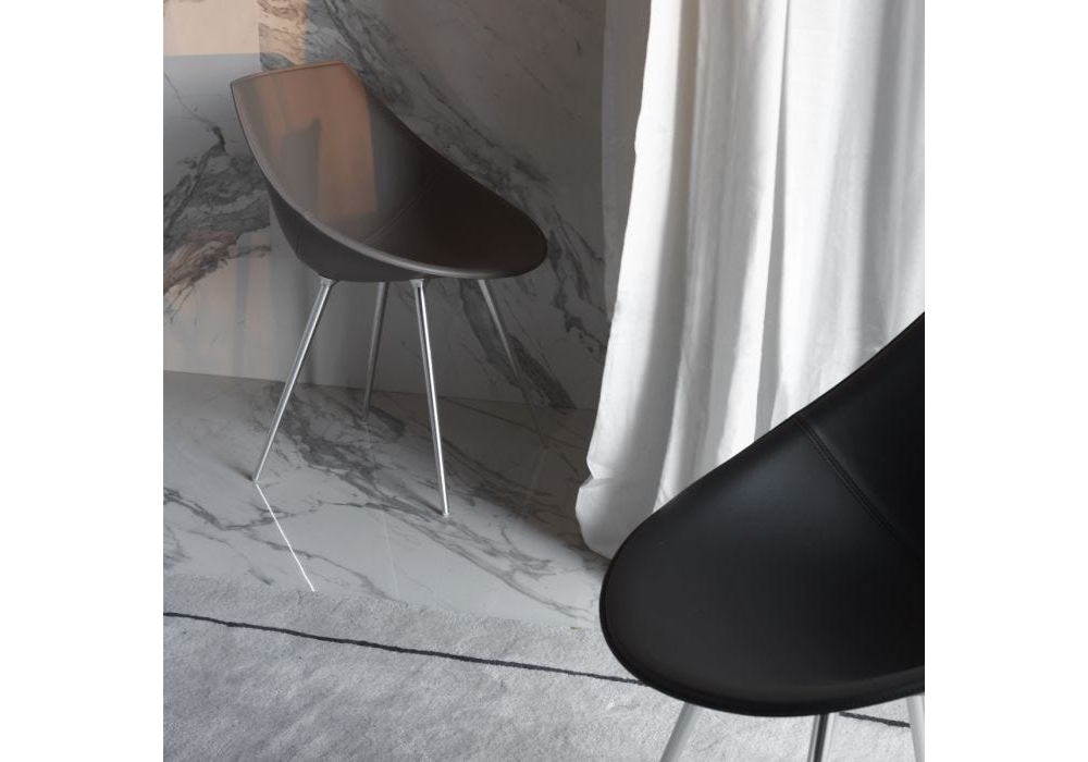 Lagò Cuoio, von Philippe Starck für Driade entworfen, ist ein Sessel mit Beinen aus eloxiertem Aluminium und einer Schale aus starrem Polyurethan, die vollständig mit Leder in den Farben Taubengrau, Braun, Weiß oder Schwarz bezogen ist. Nur für den internen Gebrauch.