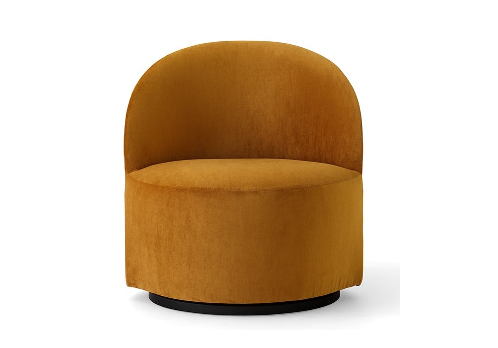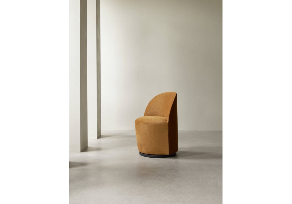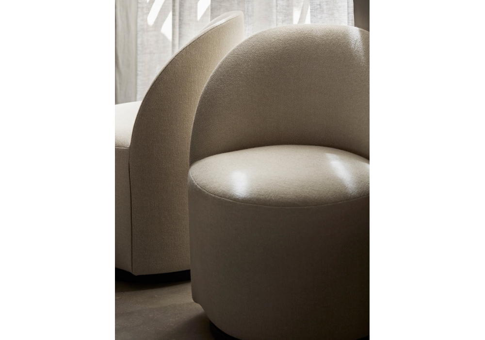 Tearoom Side von Nick Ross für Audo Copenhagen entworfen, ist ein Drehsessel, gepolstert und mit Stoff bezogen, Basis aus schwarzem MDF. Erhältlich in verschiedenen Ausführungen und Größen.