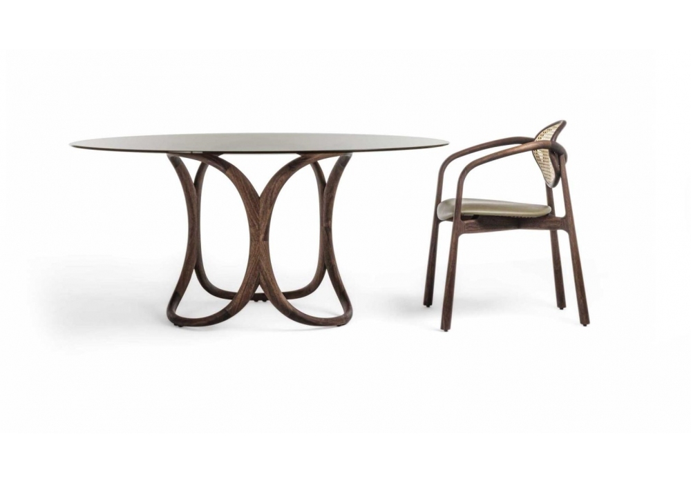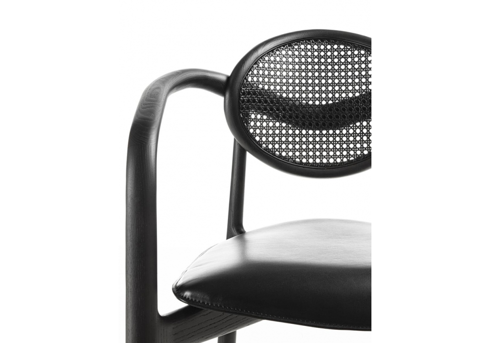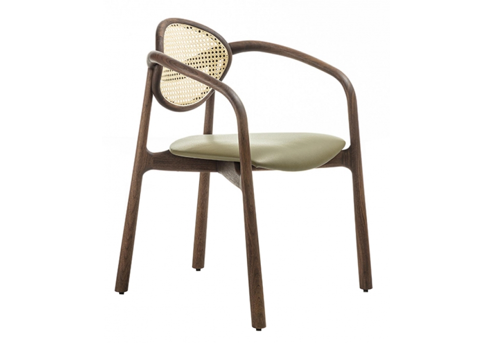 Marlena von Studio Nove.3 für Enrico Pellizzoni entworfen, ist ein kleiner Sessel mit Struktur aus Esche oder Nussbaum und Rückenlehne aus Wiener Stroh.