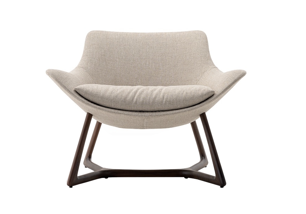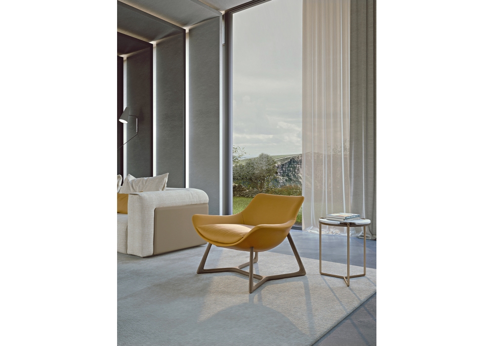 Harp von Giuseppe Viganò für Turri entworfen, ist ein Armstuhl mit Beinen aus massivem Nussbaumholz mit Polyurethanschaum, Sitzkissen aus Polyester, bezogen mit nicht abnehmbarem Leder oder Stoff. Polsterung in verschiedenen Stoffen oder Ledern.