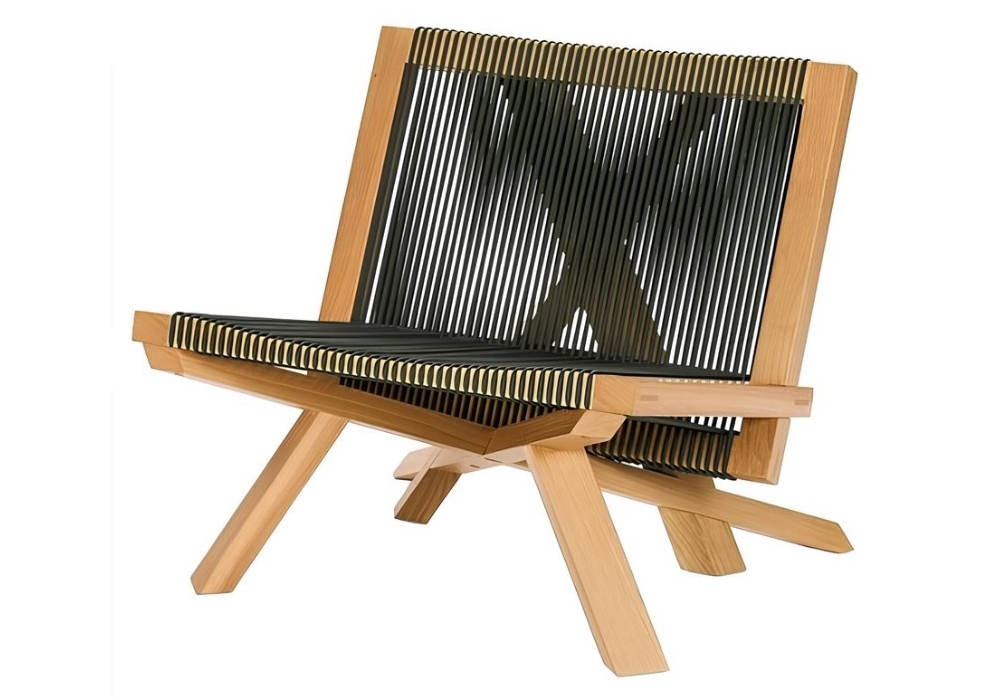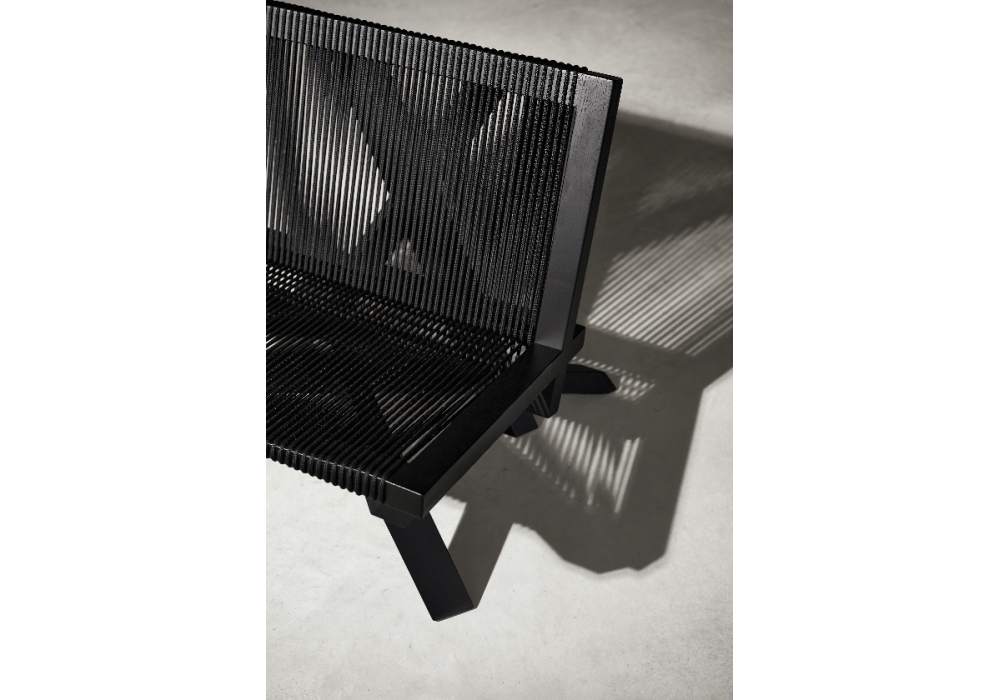 Volkshaus von Herzog & de Meuron für Classicon entworfen, ist ein Loungesessel mit Struktur aus massiver Natureiche, transparent lackiert und Sitz aus waldgrünem Seil oder Struktur aus massiver schwarz lackierter Eiche und Sitz aus schwarzem Seil. Optionale Kissen.