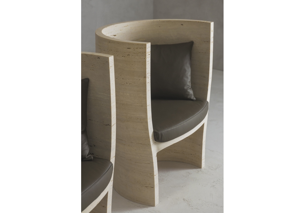 Holly von Christophe Pillet für Kreoo entworfen ist ein kleiner Sessel, der aus einem einzigen Travertinblock besteht und dessen Sitz und Rückenlehne mit bequemen Kissen aus Leder oder Stoff der Linie Mastrotto bereichert sind. Holly ist in verschiedenen Ausführungen erhältlich.
