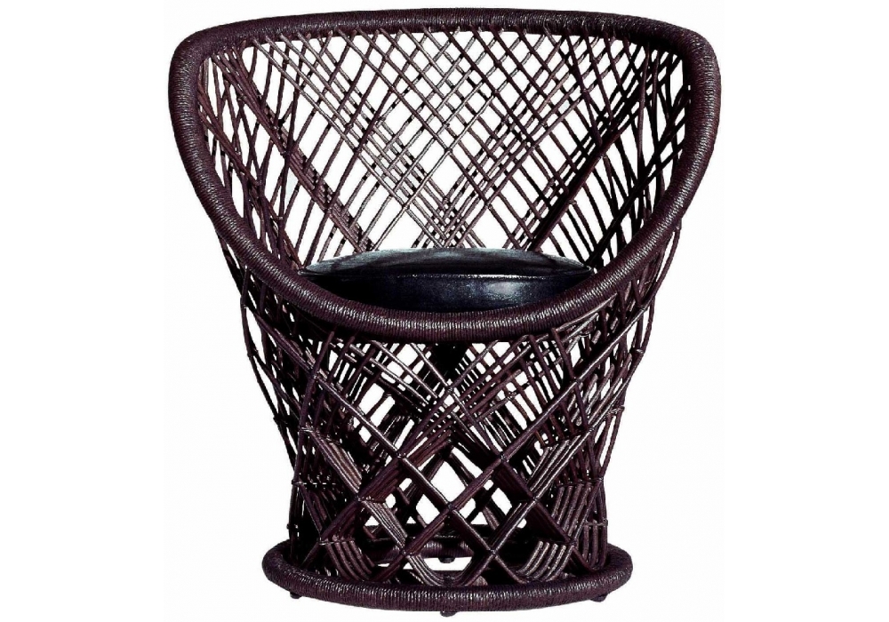 Pavo by Driade is an easy chair with structure in painted steel covered with wicker in brown colour and polyurethane foam fixed cushion with black leather cover. Indoor use only.