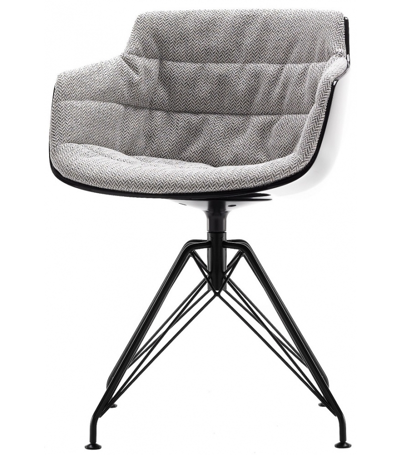 Flow Slim eine Sitzprogramm mit starker Imagewirkung und Komfort. Designt für die Wohnung, das Büro und den öffentlichen Bereich. Schale aus Polycarbonat in weiß oder schwarz - Polsterschale, dank einer thermogeformten und gepolsterten Gegenschale mit Watte aus Polyurethan und Polyesterwatte (untersteppt). Gestelle mit 4 röhrenförmige LEM-Füße und Verbindungselemente aus Stahldraht, mattlackiert weiß oder grafi tsgrau. 360° Drehmechanik.