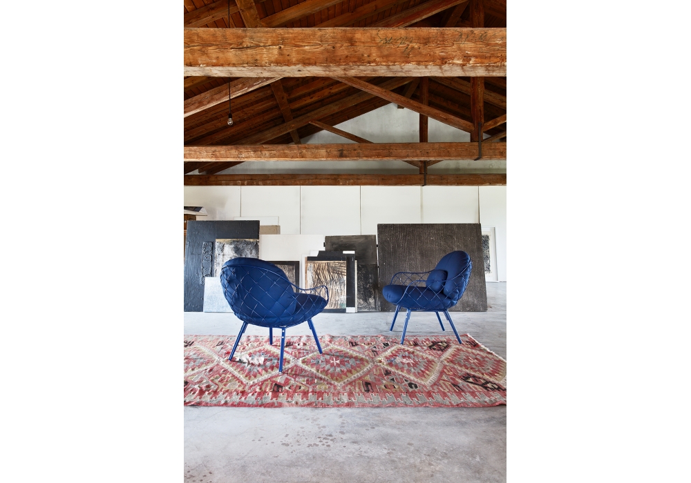 Piña von Jaime Hayón für Magis entworfen, ist ein niedriger Sessel mit Beinen aus natürlicher oder lackierter Esche, Schale aus lackiertem Stahlrohr. Sitz-/Rückenkissen aus abnehmbarem Polyurethanschaum, bezogen mit Stoff. Erhältlich in verschiedenen Ausführungen.