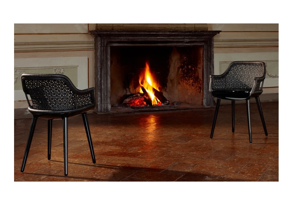 Cyborg Elegant von Marcel Wanders für Magis entworfen ist ein kleiner Sessel mit einer glänzend schwarzen Polycarbonatstruktur und einer schwarzen Korbrückenlehne.