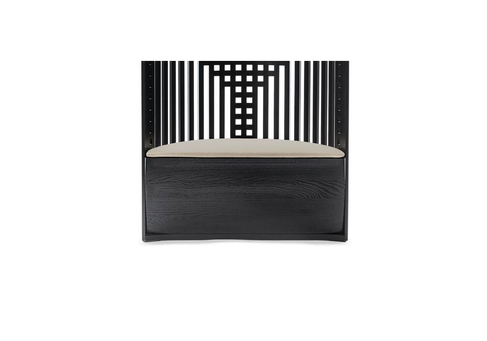 312 Willow 1 von Charles R. Mackintosh für Cassina entworfen, ist ein Sessel mit einer schwarz gebeizten Eschenstruktur mit einer internen Schublade unter dem Sitz und einer Sitzpolsterung aus speziellem Samt.