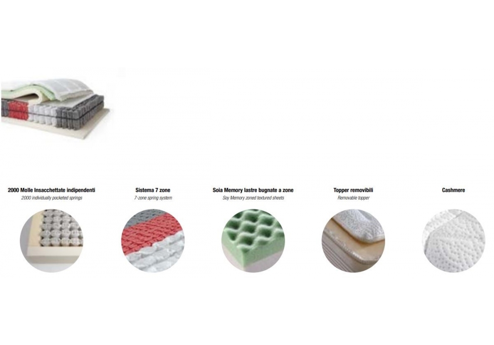Royal, entworfen und hergestellt von Twils, ist eine Matratze mit 2000 unabhängigen Taschenfedern, abnehmbaren und waschbaren Toppern und "1000" unabhängigen Federn in 7 Zonen. Enthält Aquatech-Box mit glatten Platten und verstärkten Seitenteilen. Außenfutter mit 1 waschbaren, mit Bna/Seide gepolsterten Seiten und 1 abnehmbaren, mit Soy Memory gepolsterten Seite. Außen in weißem Kaschmirstoff mit platzierter Steppung. 27 cm hoch.