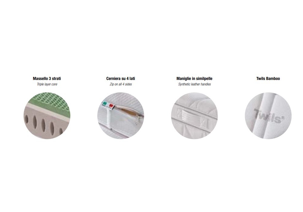 Suprema Memory, entworfen und hergestellt von Twils, ist eine Matratze mit 3-Schicht-Massivholz, 7 Aquatech-Zonen und Soy Memory mit in Zonen aufgeteilten Quaderplatten. Bezug aus Twils Bamboo, abnehmbar und maschinenwaschbar. Reißverschluss an 4 Seiten und Kunstledergriffe. Erhältlich in verschiedenen Größen. 23cm hoch.