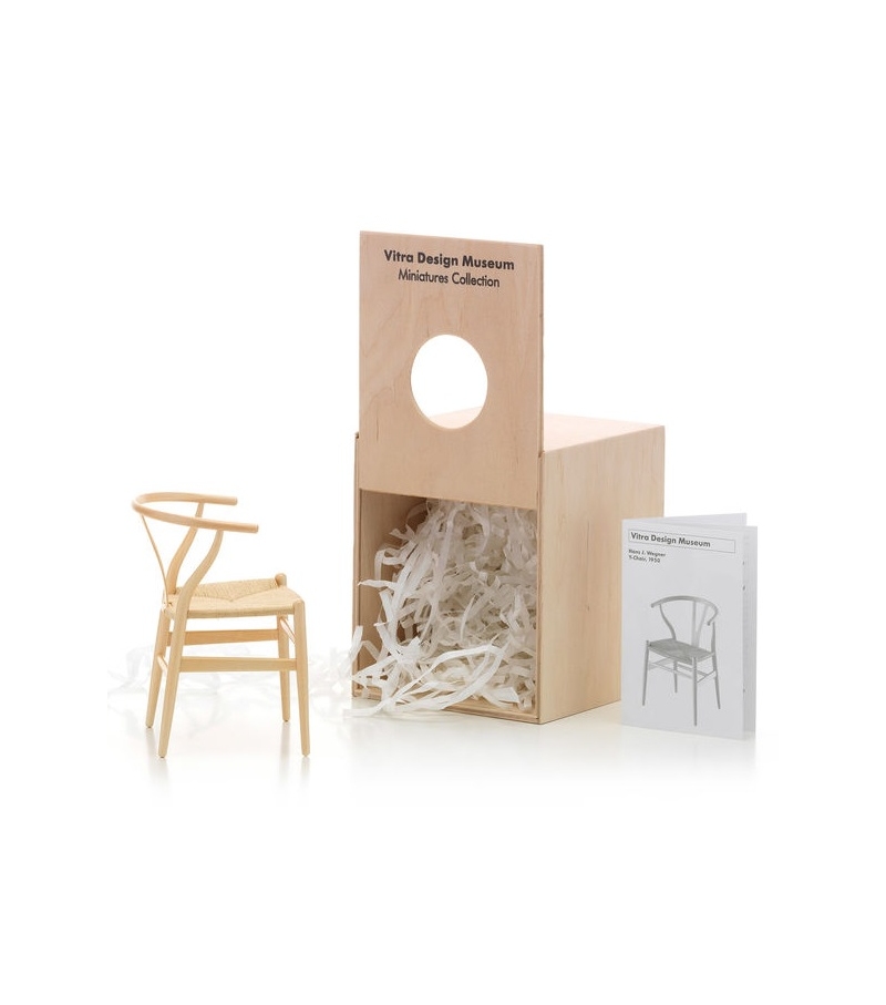 Vitra Miniature Y-Chair, Wegner: Die Sammlung des Vitra Design Museums en miniature: Die Miniatures Collection des Vitra Design Museums umfasst Schlüsselobjekte der internationalen Designgeschichte von 1850 bis heute. Jede Miniatur entspricht in Konstruktion, Material und Farbe dem Original. Die Herstellungstechniken wurden in aufwendiger Entwicklungsarbeit den Erfordernissen der Miniaturisierung angepasst. Dank dieser Originaltreue sind die Miniaturen nicht nur ein Sammlerobjekt für Möbelliebhaber, sondern auch ideales Anschauungsmaterial für Universitäten und Designschulen. Es sind bereits über 80 Modelle im Massstab 1:6 erhältlich und die Kollektion wird weiter ergänzt. Alle Modelle sind in einem Holzkistchen verpackt und werden von einer Broschüre begleitet, die den Entwurf erläutern. Der Reinerlös aus dem Verkauf der Miniaturen fliesst den Ausstellungen und Workshops des Vitra Design Museums zu.