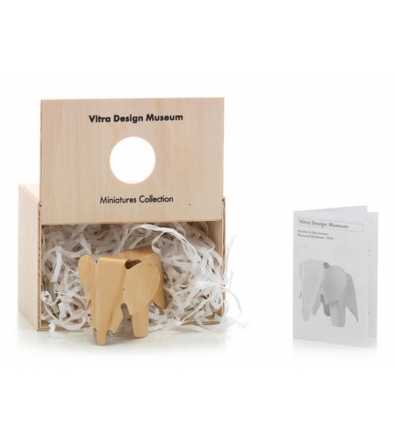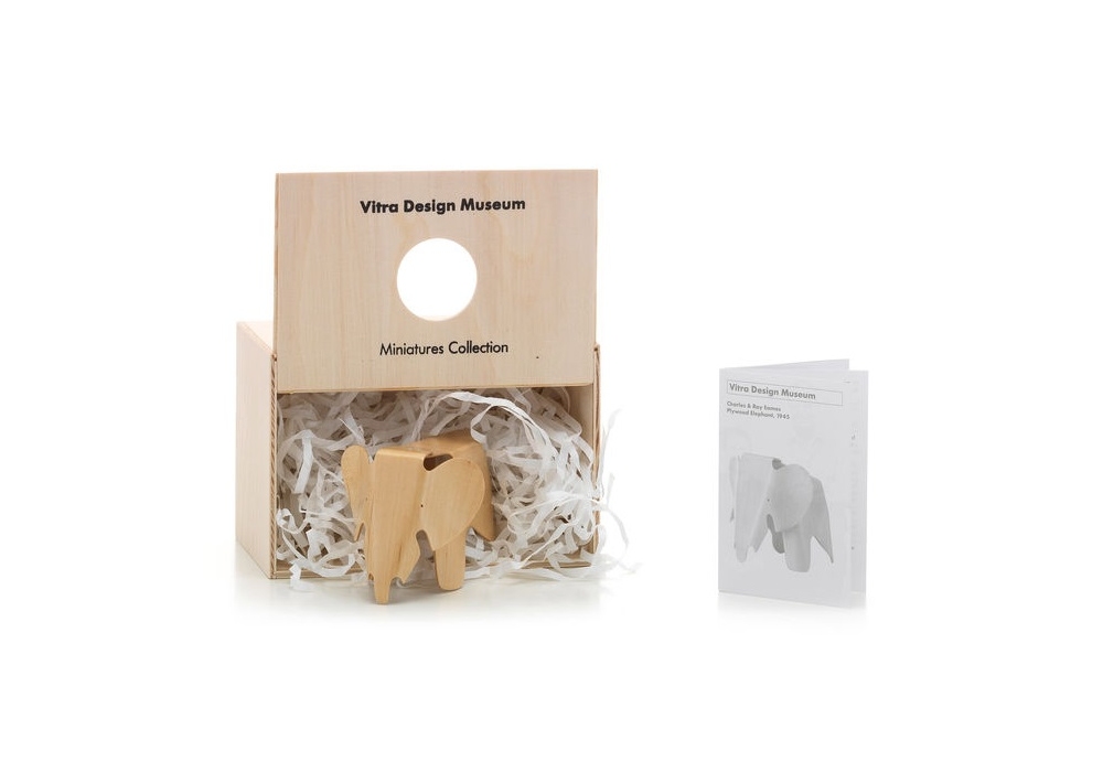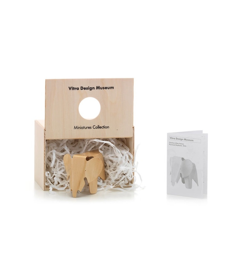 Vitra Miniature Plywood Elephant Natur, Eames: Die Sammlung des Vitra Design Museums en miniature: Die Miniatures Collection des Vitra Design Museums umfasst Schlüsselobjekte der internationalen Designgeschichte von 1850 bis heute. Jede Miniatur entspricht in Konstruktion, Material und Farbe dem Original. Die Herstellungstechniken wurden in aufwendiger Entwicklungsarbeit den Erfordernissen der Miniaturisierung angepasst. Dank dieser Originaltreue sind die Miniaturen nicht nur ein Sammlerobjekt für Möbelliebhaber, sondern auch ideales Anschauungsmaterial für Universitäten und Designschulen. Es sind bereits über 80 Modelle im Massstab 1:6 erhältlich und die Kollektion wird weiter ergänzt. Alle Modelle sind in einem Holzkistchen verpackt und werden von einer Broschüre begleitet, die den Entwurf erläutern. Der Reinerlös aus dem Verkauf der Miniaturen fliesst den Ausstellungen und Workshops des Vitra Design Museums zu.