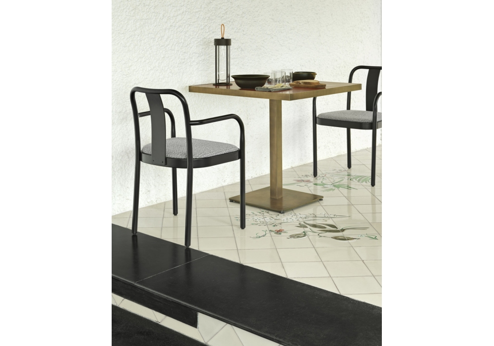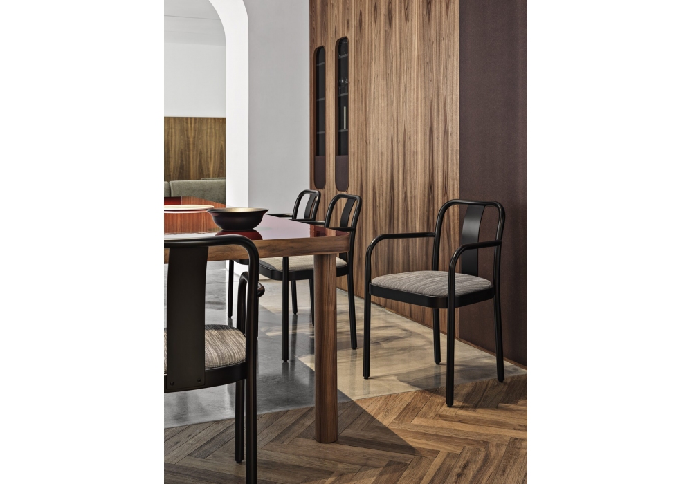 Sugiloo von Michael Anastassiades für Gebrüder Thonet Vienna entworfen, ist ein Stuhl aus gebogener Buche, verfügbar in verschiedenen Ausführungen. Sitz mit Stoff- oder Lederbezug, Rückenlehne aus Sperrholz. Der Stuhl ist auch mit oder ohne Armlehnen erhältlich.