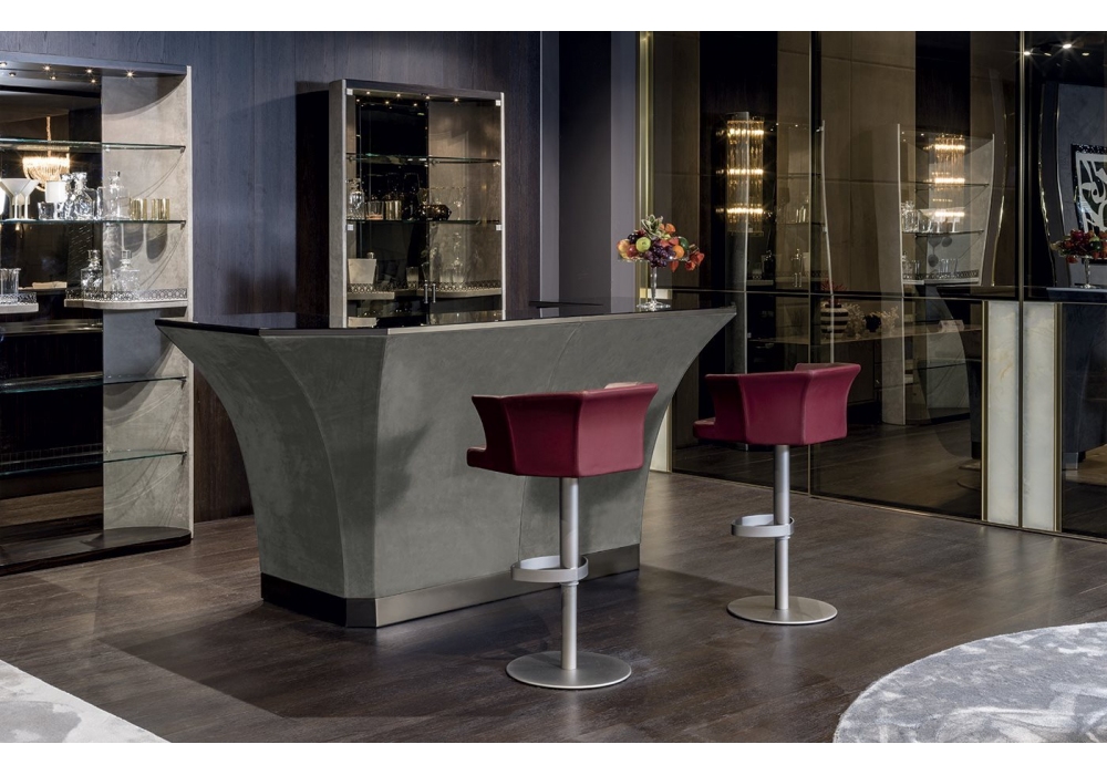 Delon von Kazemekas für Longhi entworfen, ist ein Hocker mit Eisenstruktur, kaltgeformtem Schaum und mit nicht abnehmbarem Leder bezogen. Der Metallsockel ist um 360° drehbar und mittels Gas-Teleskopsäule „Stabilus“ höhenverstellbar.