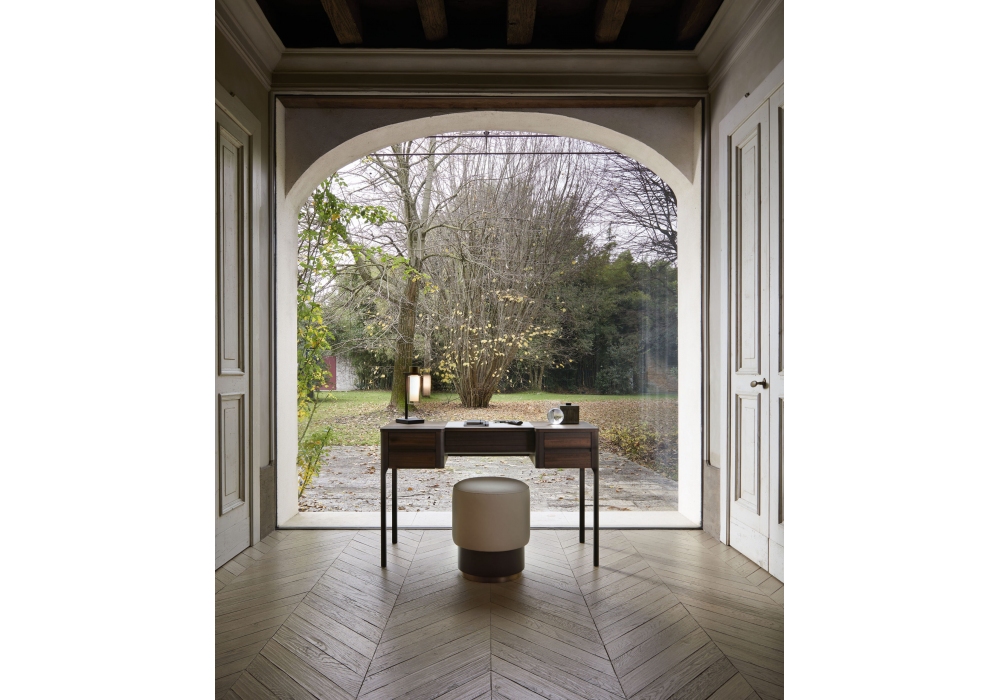 Fontana von Joe Garzone für Conte Casa entworfen, ist ein Sitzpuff mit einer runden Basis aus lackiertem Metall oder brüniertem Messing, einer Holzstruktur und einem mit Stoff oder Leder bezogenen Sitz. Verfügbar in mehreren Ausführungen.