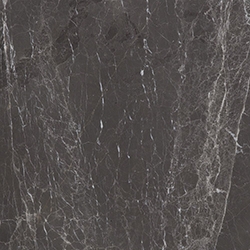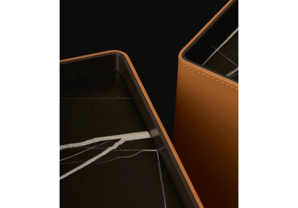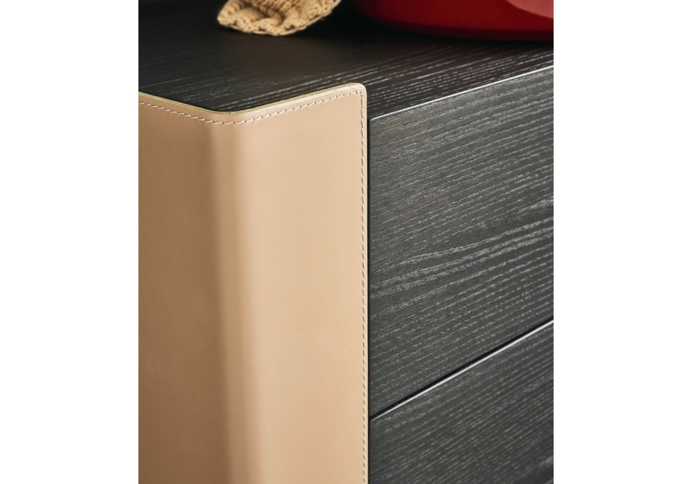 Chloe von Carlo Colombo für Poliform entworfen, ist ein Nachttisch mit Fronten aus schwarzer Ulme, Platte aus Marmor oder Holz und Außenstruktur aus Aluminium mit Kernlederbezug.