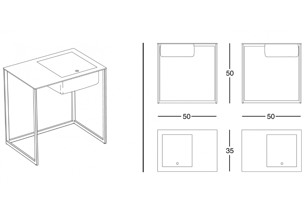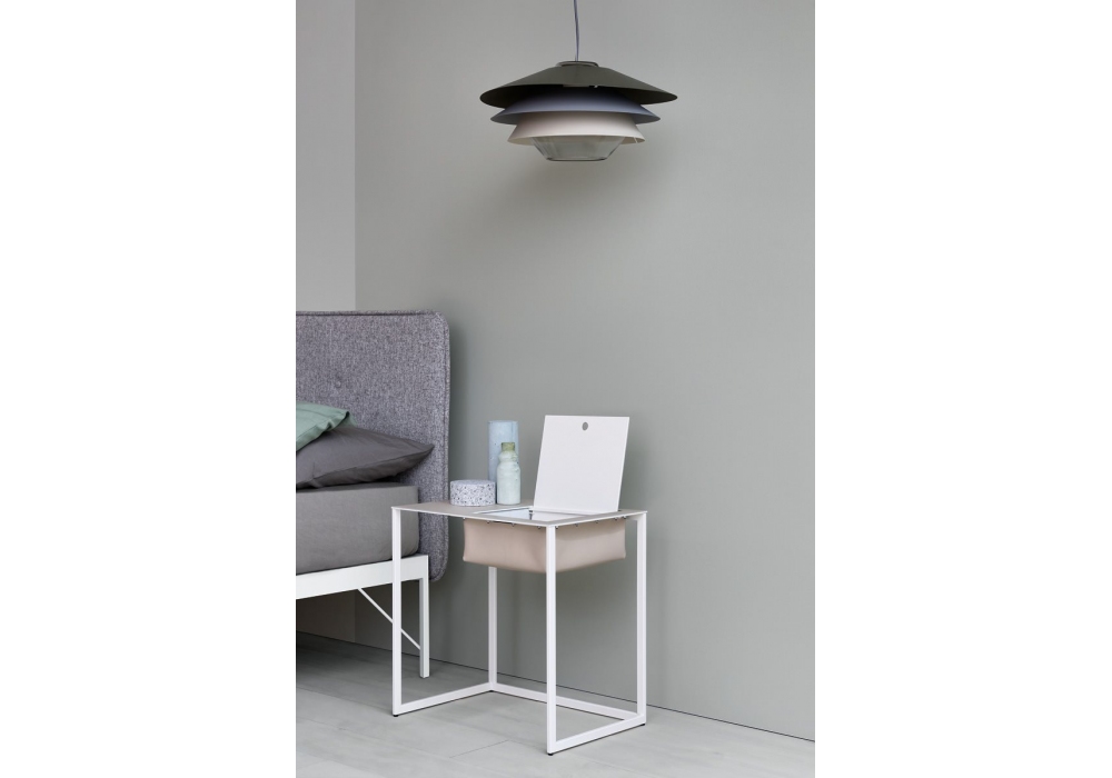 643 Taschino von Gabriele Rosa für Zanotta ist eine Nachttisch mit Schublade. Gestell und Platte aus weiß, schwarz oder graphitfarbenem Stahl. Platte und Ablagefach aus Kernleder pigmentato 90. Das Ablagefach ist mit Kippöffnung versehen und ist entweder rechts oder links verfügbar.