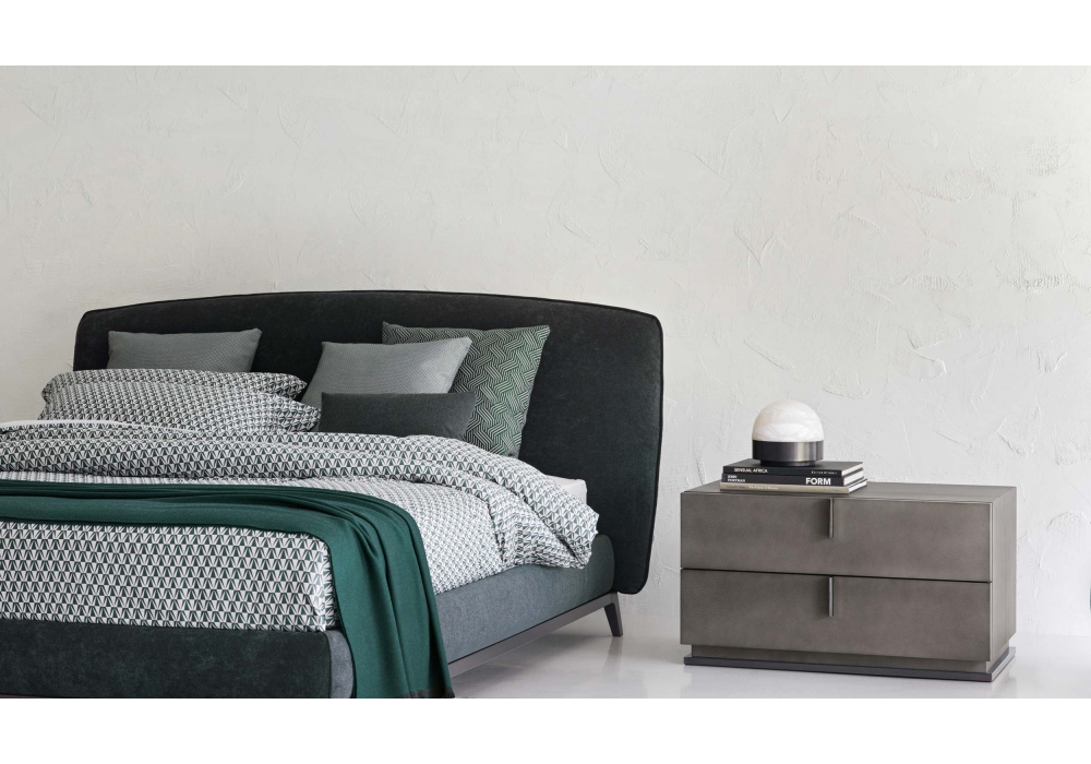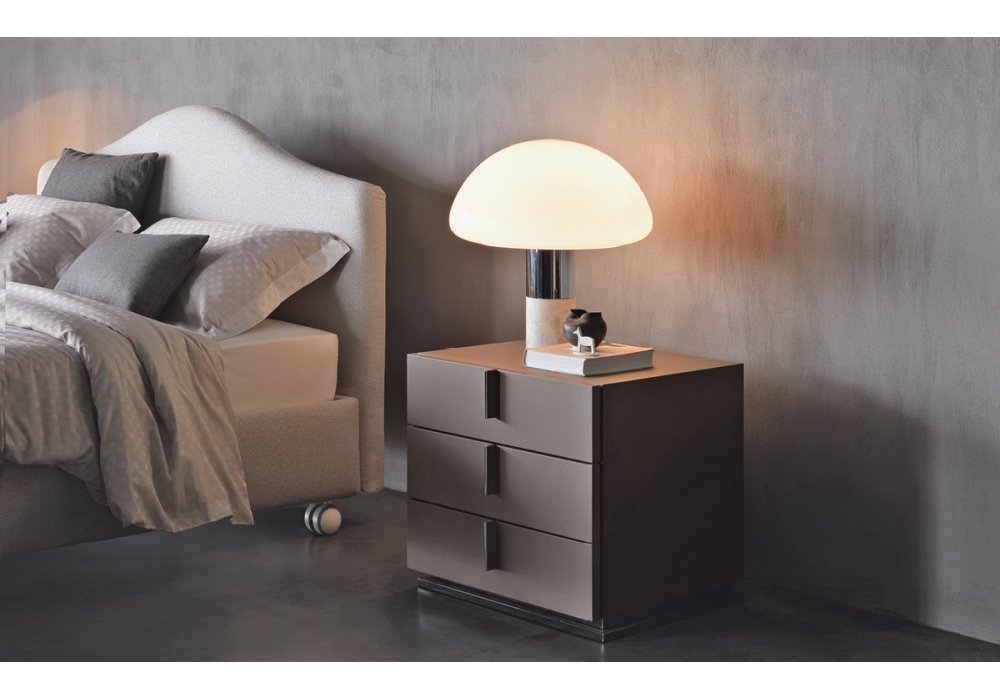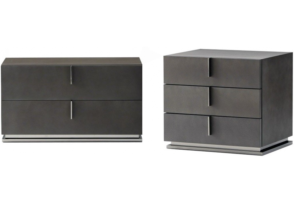 Ari von Emanuela Garbin & Mario Dell'Orto für Flou entworfen, ist einer Nachttisch aus matt ausgeführter lackierung mit "galuchat" effekt, verfügbar in 2 Farbtönen: deserto oder laguna. Griffe und Untergestell chromschwarz. Auch verfügbar in 2 verschiedene Modelle: mit 2 oder 3 Schubladen.