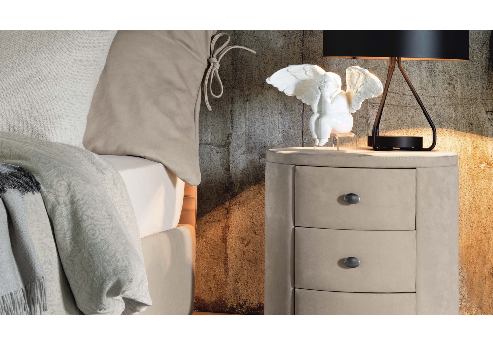 Condotti von Emanuela Garbin & Mario Dell'Orto für Flou entworfen, ist einer runder Nachttisch mit zwei oder drei Schubladen, die sich ganz herausziehen lassen und gedämpft zurückkehren. Innenauskleidung aus Birkenholz. Vollständig mit Leder überzogene Struktur. Griffe mit brüniertem gebürstetem Oberflächenfinish. Auf Wunsch, ist auch verfügbar eine Tischplatte aus Glas.