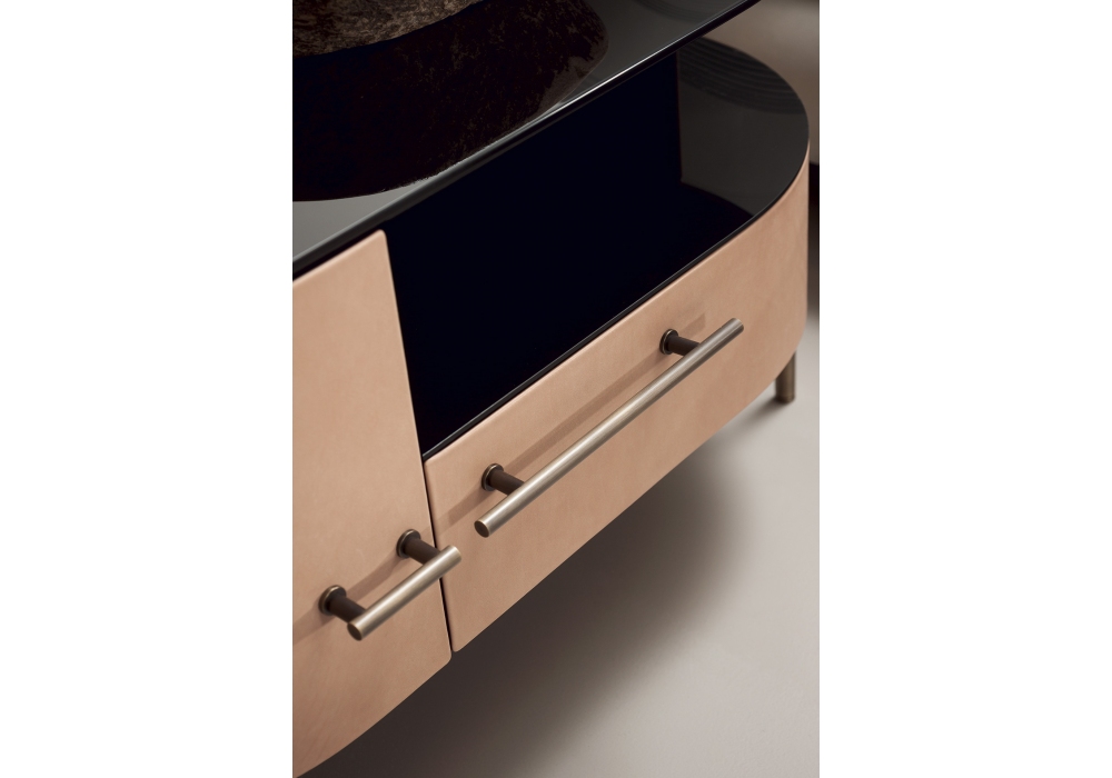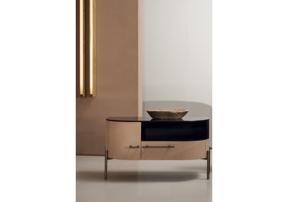 Plissé von Draga&Aurel für Baxter entworfen, ist eine Nachttisch mit Sockel, Griff und Details aus brüniertem Messing mit mattem Lack. Struktur aus gebogenem Sperrholz und MDF, mattschwarz gebeiztes Eichenfurnier. Futter aus Naturahorn. Haustür und Schublade mit Leder bezogen. Schwarz hinterlackierte Glasplatte.