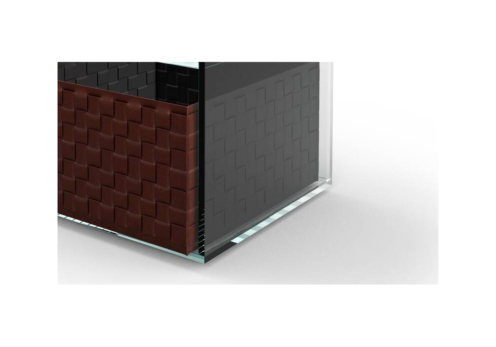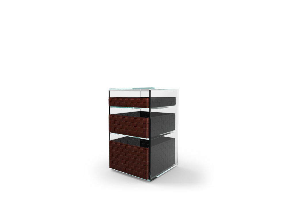L29 Volage Ex-S Night von Philippe Starck für Cassina entworfen, ist ein Nachttisch aus extra klarem oder geräuchertem gehärtetem Glas mit 3 Fächern. Es ist möglich, Körbe mit unterschiedlichen Abmessungen in Leder oder Weide hinzuzufügen.