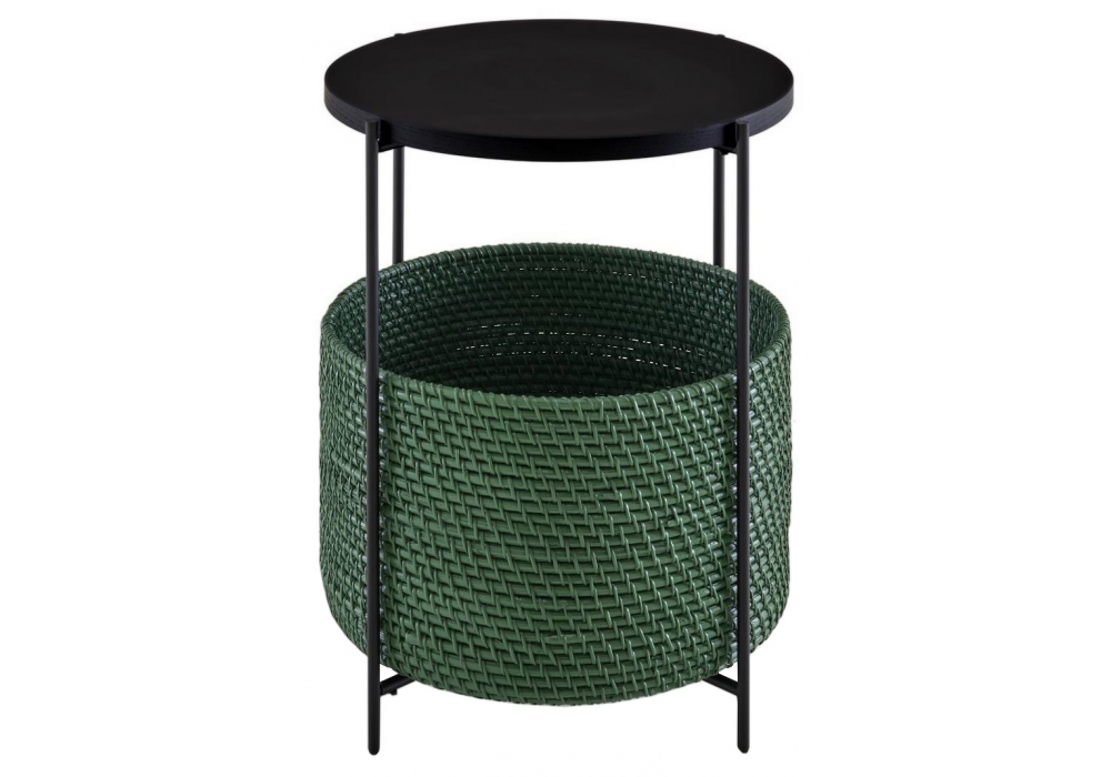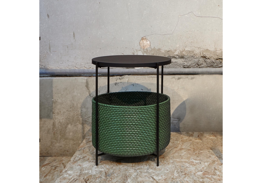 Cestino von Evangelos Vasileiou für Ligne Roset entworfen, ist ein Nachtkästchen mit Gestell aus mattschwarz lackiertem Stahl, MDF-Platte mit mattschwarz gebeiztem Eschenfurnier und geflochtenem Rattankorb (Ø 40 cm), verfügbar in 2 Ausführungen. Ein Bein kann abgenommen werden, damit der Korb herausgezogen oder wieder hineingeschoben werden kann.