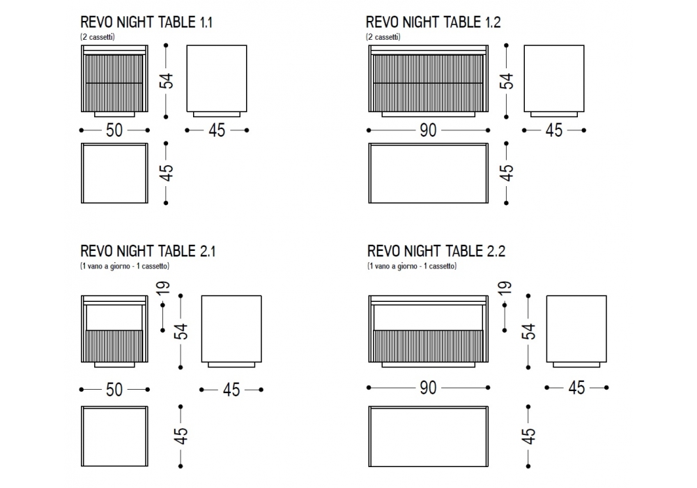 Revo Night Table von Giuliano Cappelletti für Riva 1920 entworfen, ist ein Nachttisch aus furnierter Tischlerplatte, gekennzeichnet durch einen Rahmen, der die Platte enthält, mit 2 Schubladen oder 1 Schublade und 1 offenem Fach. Schubladen mit traditioneller Stab-Schwanz-Verbindung und Fronten mit besonderer vertikaler Bearbeitung, Fresart, die einen modernen und dynamischen geometrischen Effekt erzeugt.