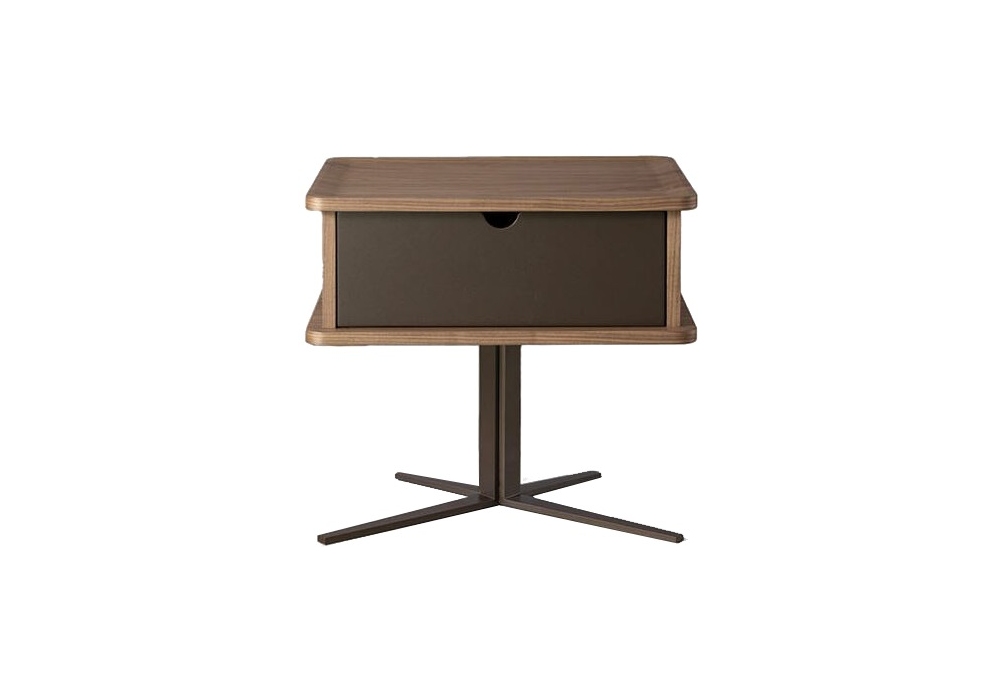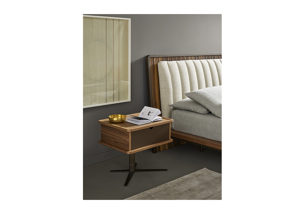 Nelson, von Matteo Nunziati für Bonaldo entworfen, ist ein Nachttisch mit äußerer Struktur aus furniertem Holz in Canaletto-Walnuss. Schublade aus matt bronzefarben lackiertem Holz, Basis aus bronzefarben lackiertem Metall.
