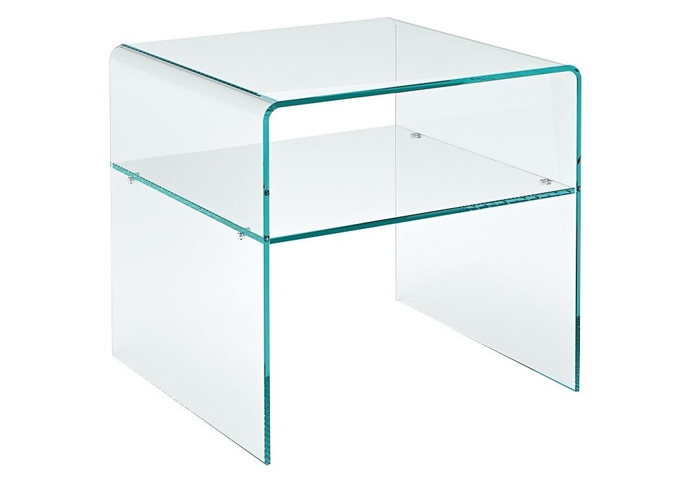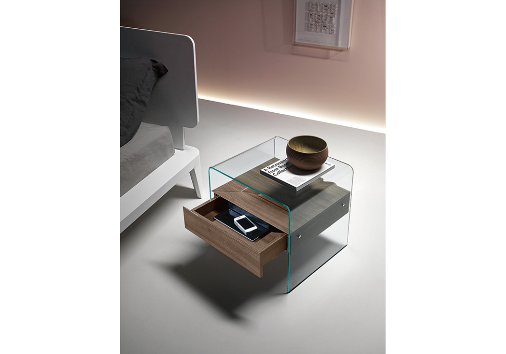 Rialto Night von CRS Fiam entworfen, ist ein Nachttisch aus gebogenem 8 mm Glas. Erhältlich mit Glasboden oder mit Schublade in Tabakeiche oder weiß lackiert.