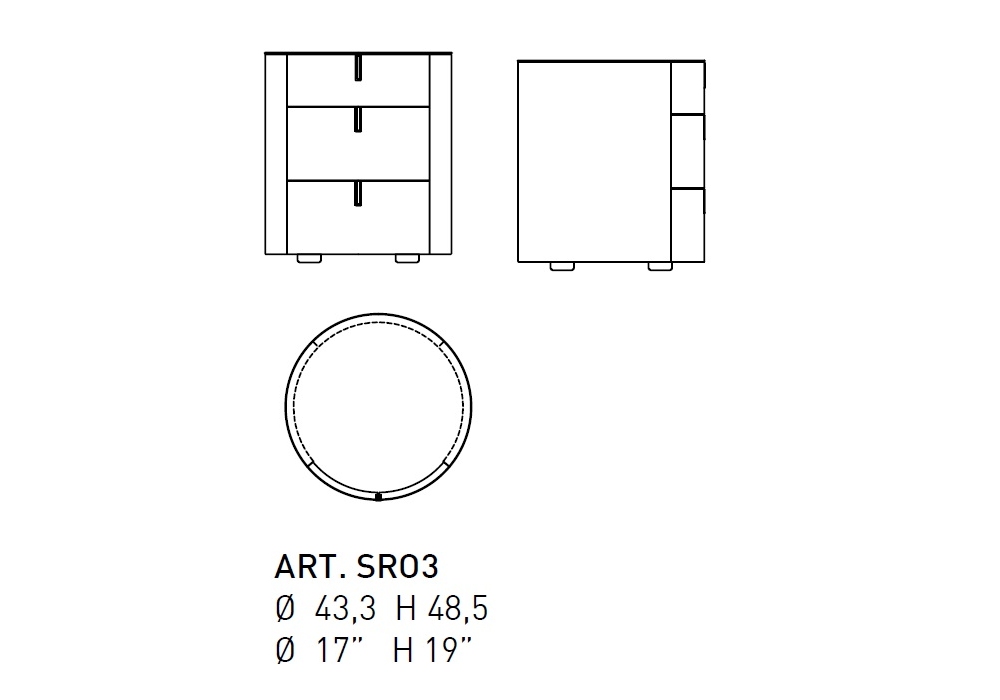 Round 3 von Giuseppe Bavuso für Alivar entworfen, ist ein Nachttisch mit 3 Schubladen. Struktur aus dampfgebogenem MDF, bezogen mit Leder mit Ziernähten oder mit wärmebehandelter Eiche. Schubladen mit bremsenden Metallführungen und Front mit Leder bezogen mit Ziernähten. Griffe aus Metall. Tablett aus peltrox-, bronze-, titan- oder champagnerfarben lackiertem Stahl.