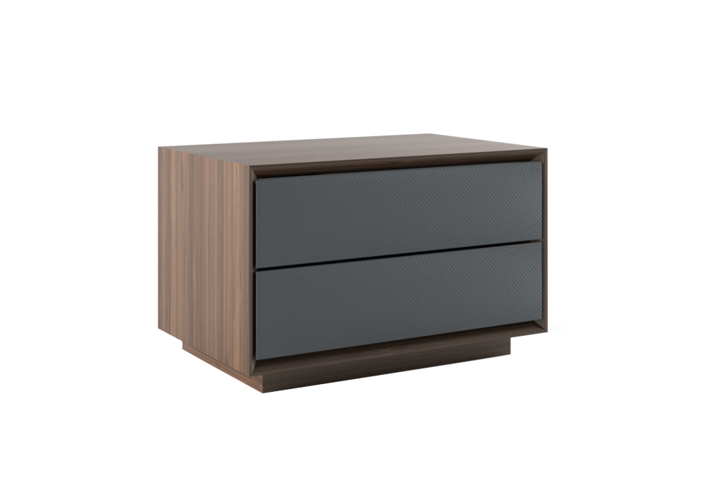 Amazon von Christophe de Sousa für Gual Design entworfen, ist ein Nachttisch mit Struktur aus Nussbaumfurnier und Schubladenfronten, die mit verschiedenen Stoffen bezogen sind.