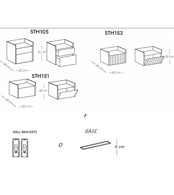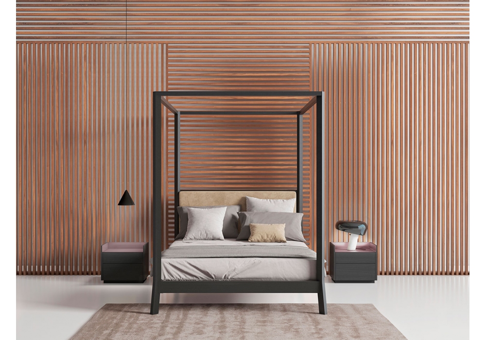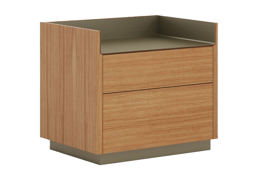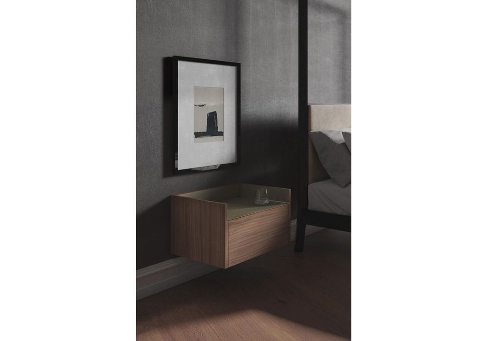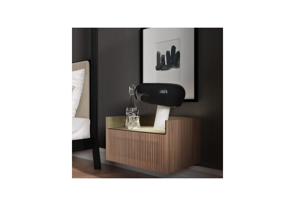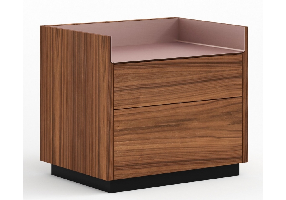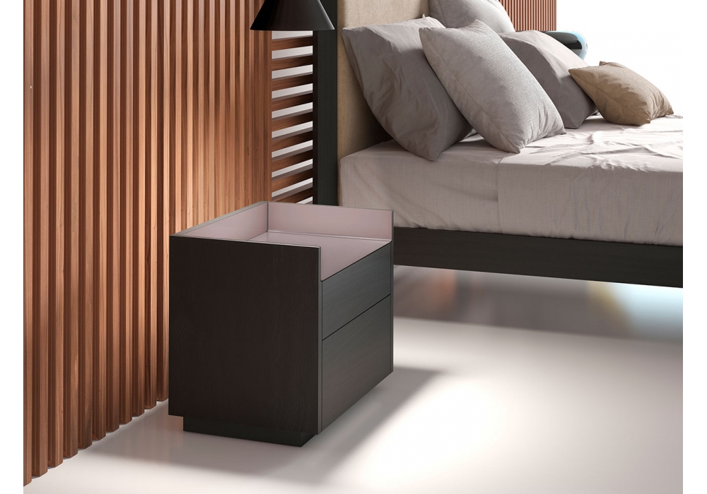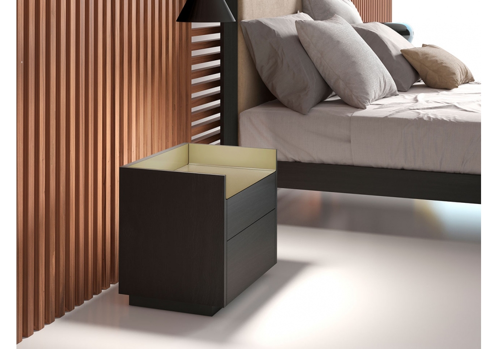Stockholm von Mario Ruiz für Punt entworfen, ist ein Nachttisch mit Struktur aus MDF, furniert mit Eichen- oder Walnussholz. Flügeltüren ohne Griff oder Schubladen mit Vollauszugsführungen. Sockel aus thermolackiertem Stahl in Schwarz oder Bronze mit verstellbaren Füßen oder Halterungen zum Aufhängen an der Wand. Obere Platten aus eloxiertem oder mattem Metall.