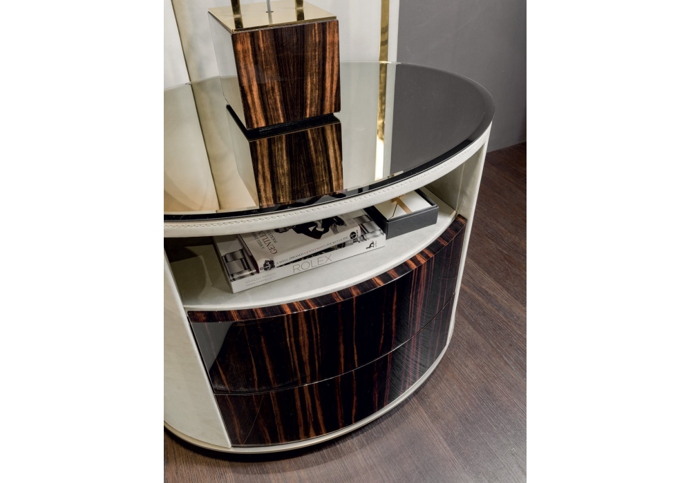 Elise von Giuseppe Iasparra für Longhi entworfen, ist ein Nachttisch mit Basis aus glänzendem oder mattem Metall, Struktur mit Leder bezogen und Schubladen aus Holzfurnier. Marmor- oder Spiegelplatte. Auf Anfrage Schubladen passend zur Struktur.