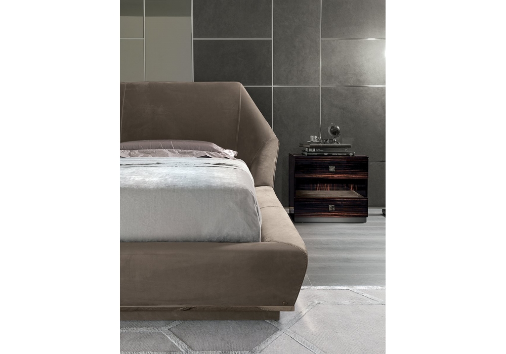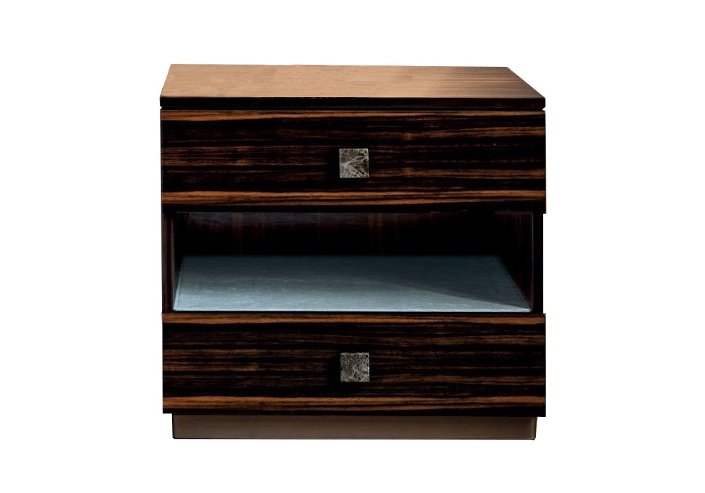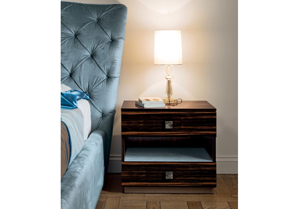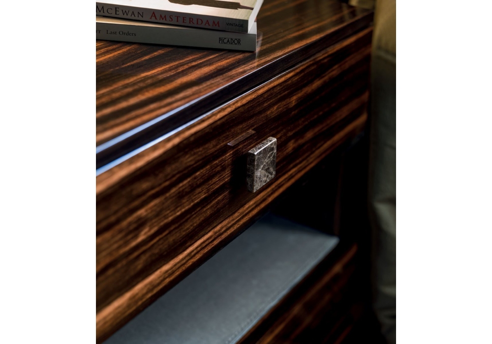 Phil von Elle Studio für Longhi entworfen, ist ein Nachttisch mit 2 Schubladen mit Holzstruktur in Essenz oder Hochglanzlack. Zentrales Fach mit Leder- oder Samtbezug. Bronze lackierter Sockel und Griffe aus Marmor oder Leder.