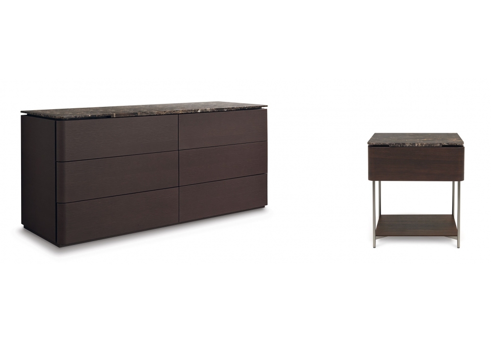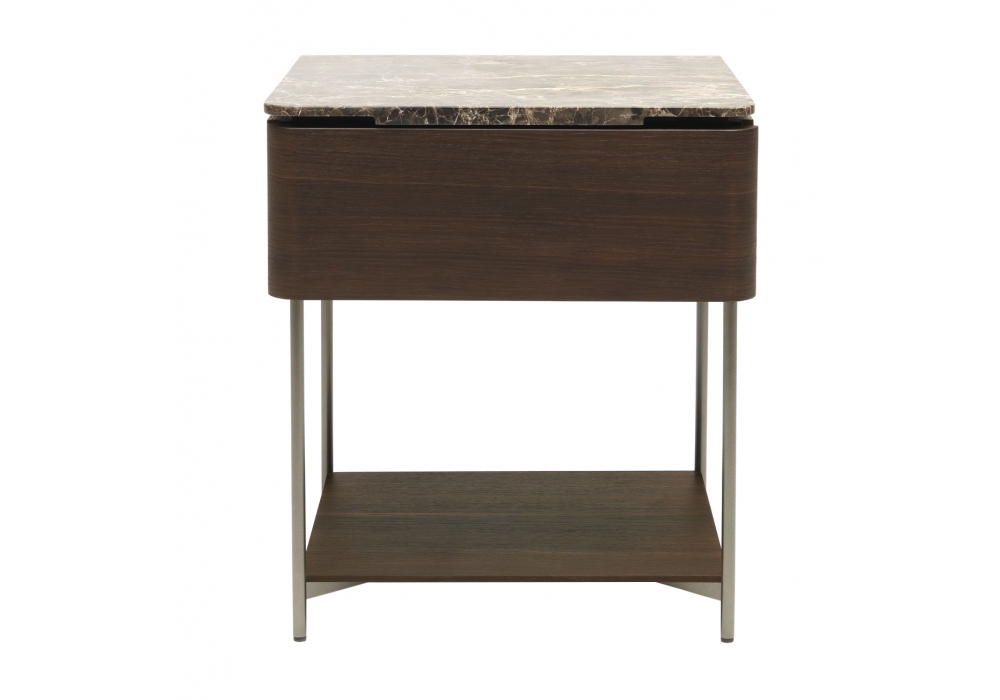 Lindo von Francesco Lucchese für MisuraEmme entworfen, ist ein Nachttisch mit Holz- oder Marmorplatte. Unteres Regal in Stütze und Schublade aus Holz. Gunmetal lackierter Metallsockel.