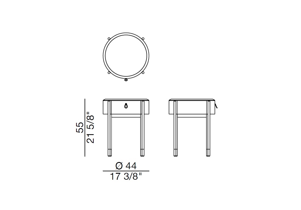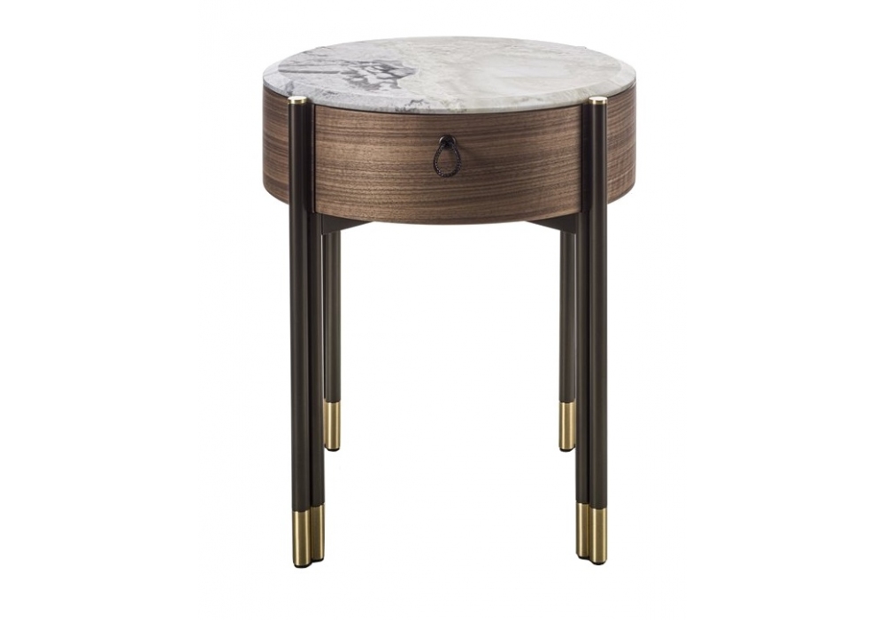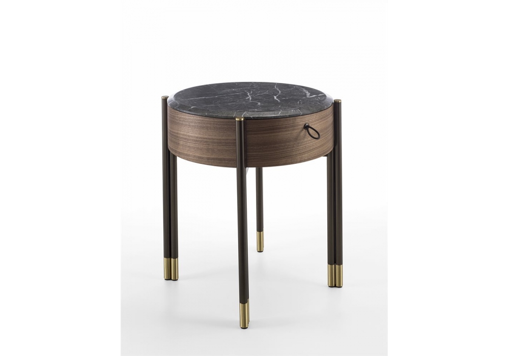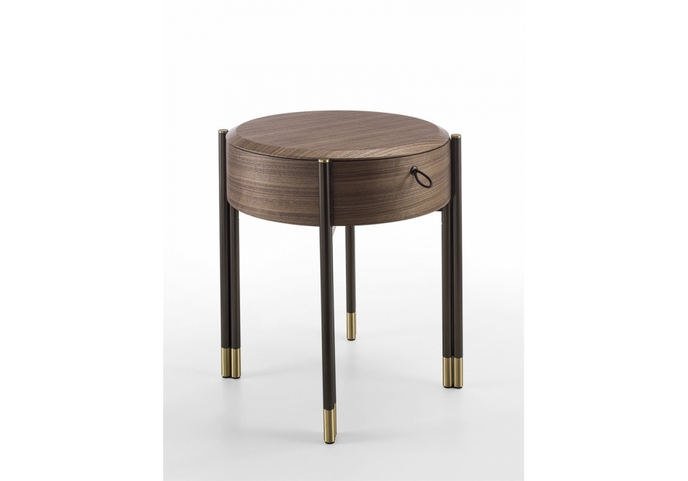 Bayus Runde 44 von Gabriele & Oscar Buratti für Porada entworfen, ist ein Nachttisch aus Canaletta-Walnuss, ausgestattet mit einer Schublade mit Holz- oder Marmorplatte. Innenseite der Schublade mit kratzfester Titanoberfläche und Griff aus dunkelbraunem Leder, gewebt in Scoubidou-Technik. Basis aus bronzefarbenem Metall und Spitzen aus gebürstetem Messing.
