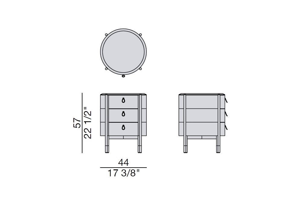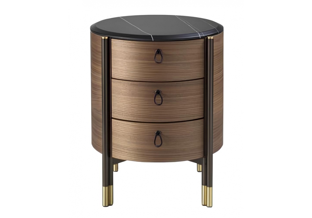 Bayus Tondo 3 von Gabriele & Oscar Buratti für Porada entworfen, ist ein Nachttisch aus Canaletta-Walnuss mit drei Schubladen mit Holz- oder Marmorplatte. Innenseite der Schubladen in kratzfestem Titan-Finish und Griff aus Leder in der Farbe Testa di Moro. Basis aus Bronzoro-Metall und Spitzen aus gebürstetem Messing.