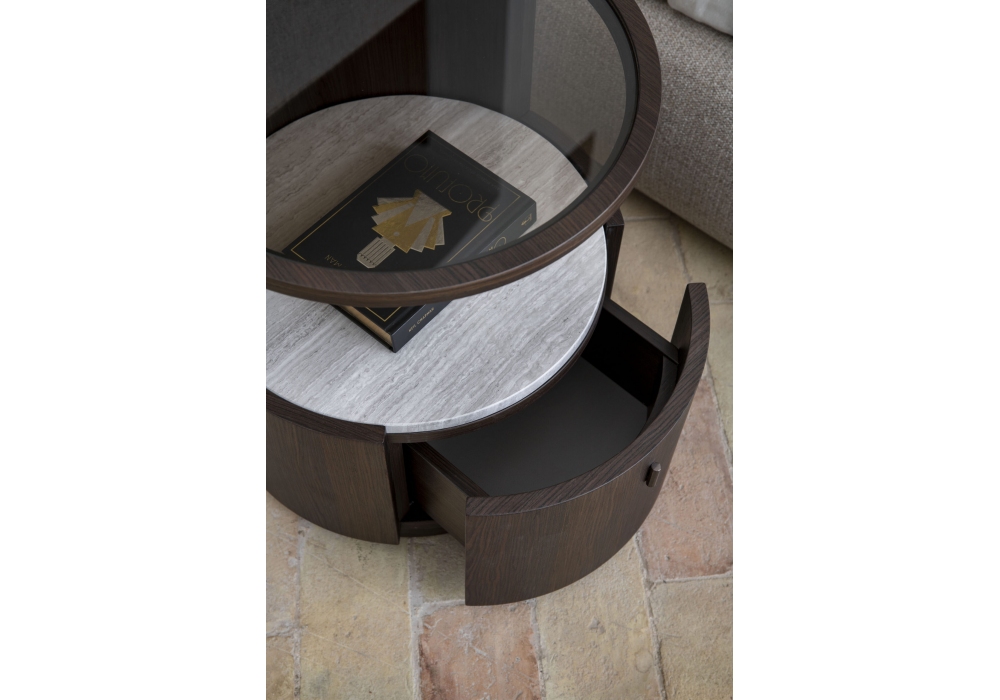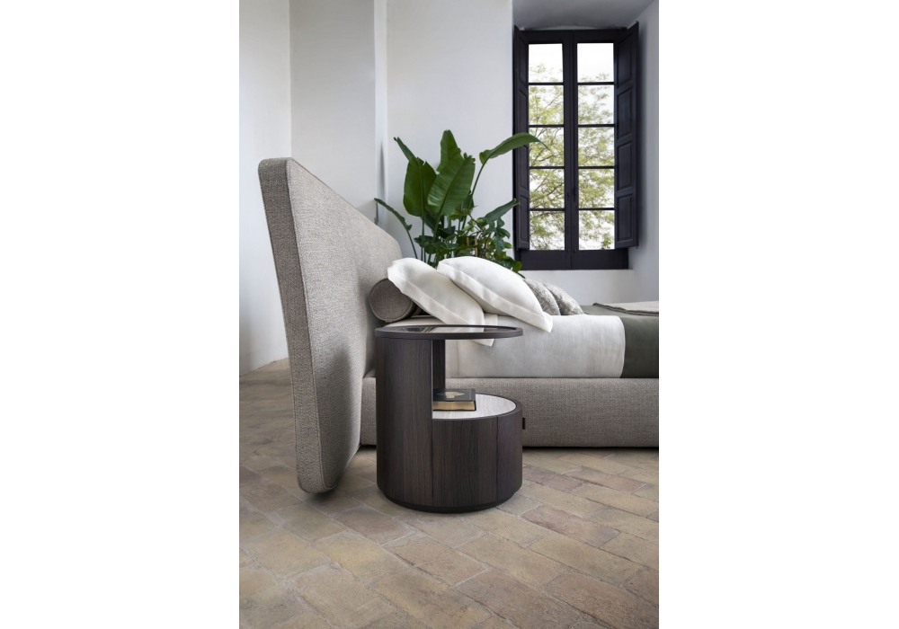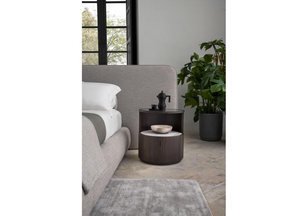 Roof von Joe Garzone für Conte Casa entworfen, ist ein Nachttisch mit einer gebogenen Struktur aus kreisförmigem Massivholz, kombiniert mit einer hängenden Platte aus Glas, Marmor oder Holz in der gleichen Farbe wie die Struktur. Gebogene Schublade mit einer zweiten Platte aus Marmor oder Holz. Griff aus brüniertem Messing oder lackiertem Metall. Verfügbar in mehreren Ausführungen.