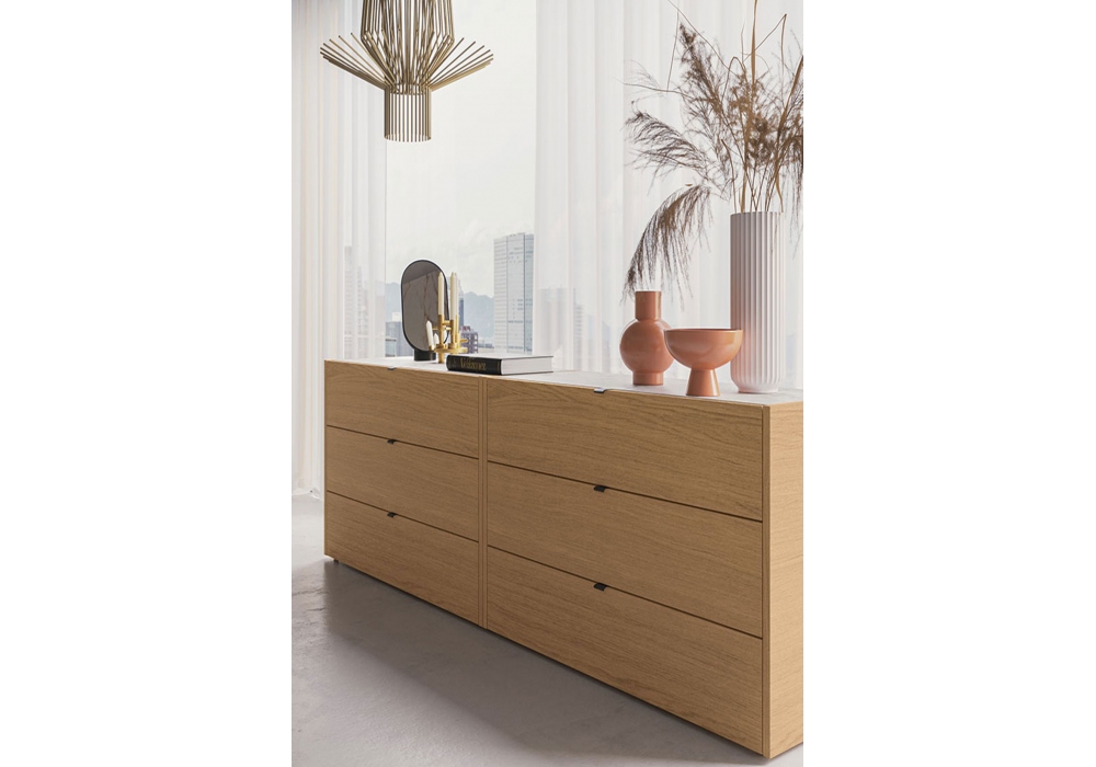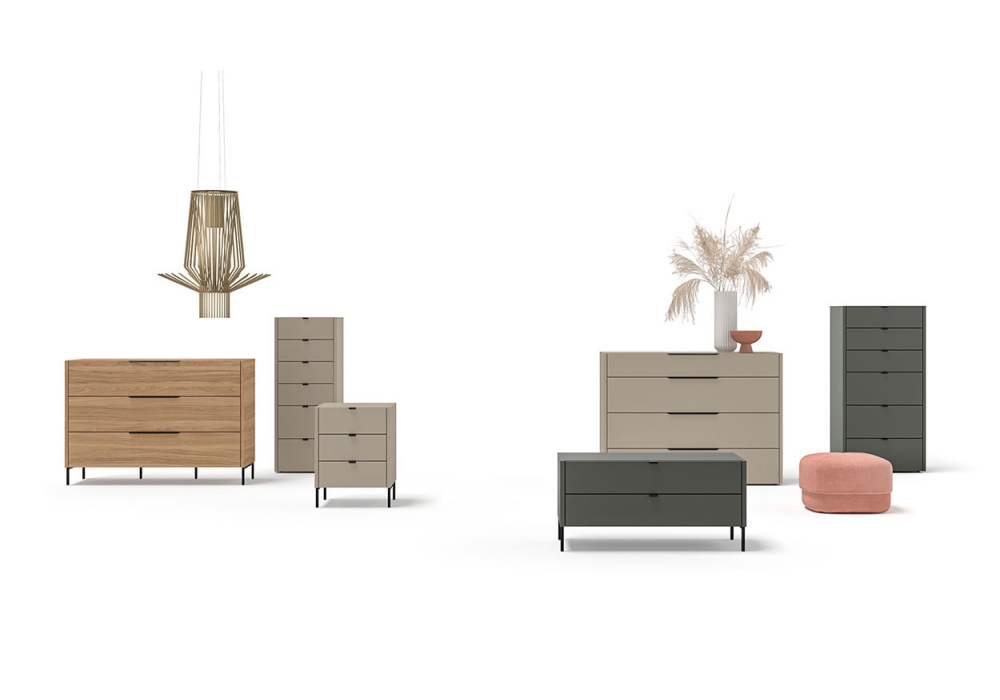 Filo von Kico entworfen, ist eine Kollektion von Kommoden und Nachttischen aus Spanplatten mit aufgesetzten Griffen in zwei Varianten und der Möglichkeit, diese mit passenden Beinen zu ergänzen.