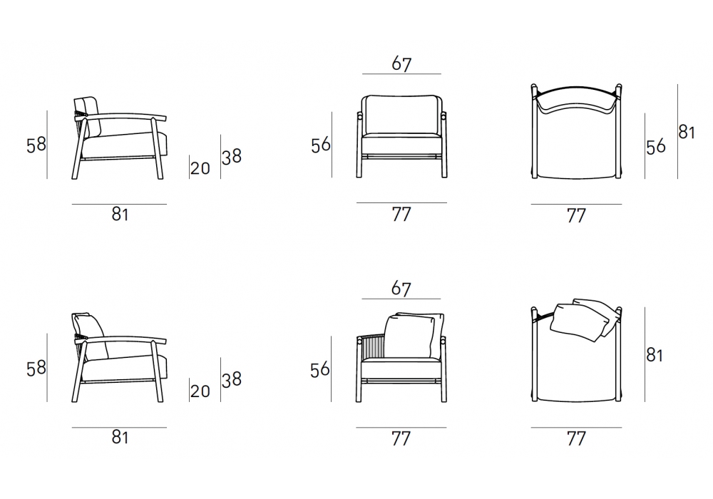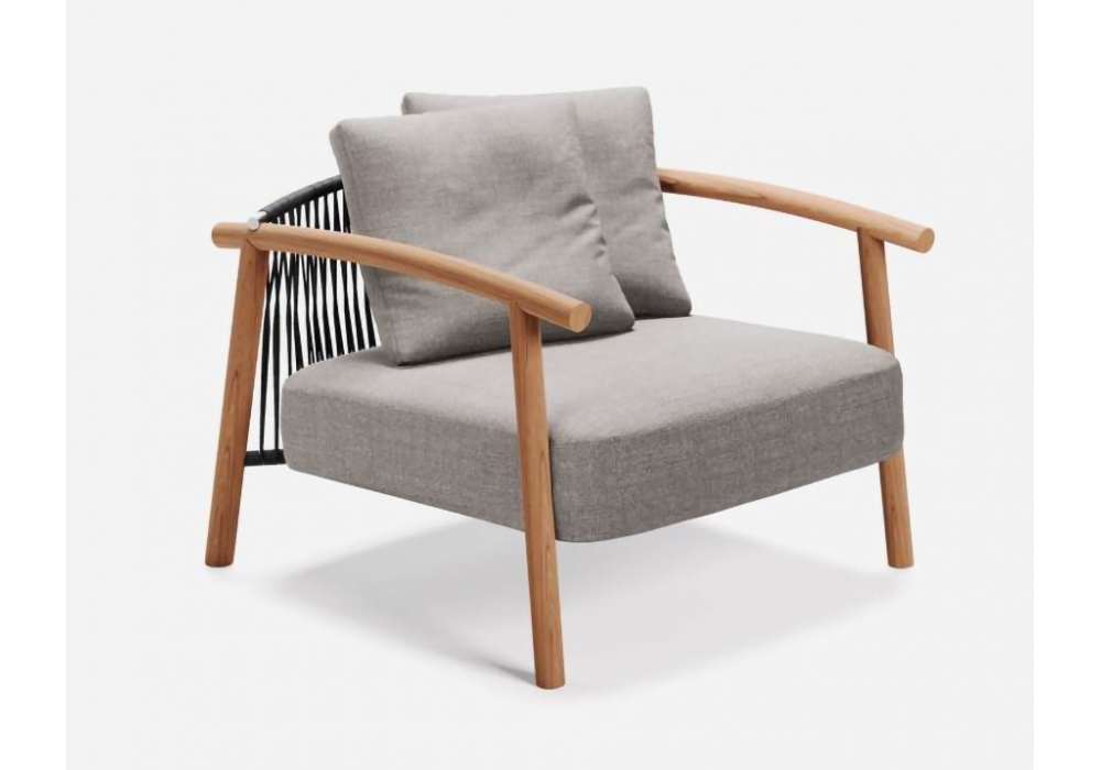 Kasimi von Mist-o für Living Divani entworfen ist ein Outdoor-Sessel mit Armlehnen mit Struktur aus Teakholz und Rückenlehne aus satiniertem Edelstahl. Das Geflecht besteht aus gewachstem Seil mit einer Polsterung aus offenzelligem Polyurethanschaum, die mit Polyesterfasern überzogen ist, und einem dränierenden Stoffbezug. Der Bezug besteht aus Outdoor-Stoff und ist mit speziellen Reißverschlüssen vollständig abnehmbar. Kasimi ist in verschiedenen Ausführungen erhältlich.