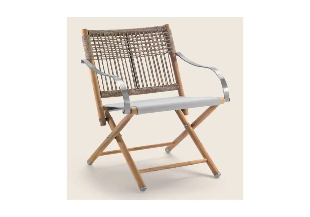 Lauren Outdoor von Antonio Citterio für Flexform entworfen, ist ein Armstuhl mit klappbarer Struktur aus massivem Iroko-Holz, geflochtener Rückenlehne aus mattem Polypropylen-Kordel und Metallteilen in den Ausführungen brüniert, matt gebürstet oder mattes Titan 710, Sitz aus abnehmbarem, wasserabweisendem und schmutzabweisendem Canvas in der Farbe Dunes 9720.