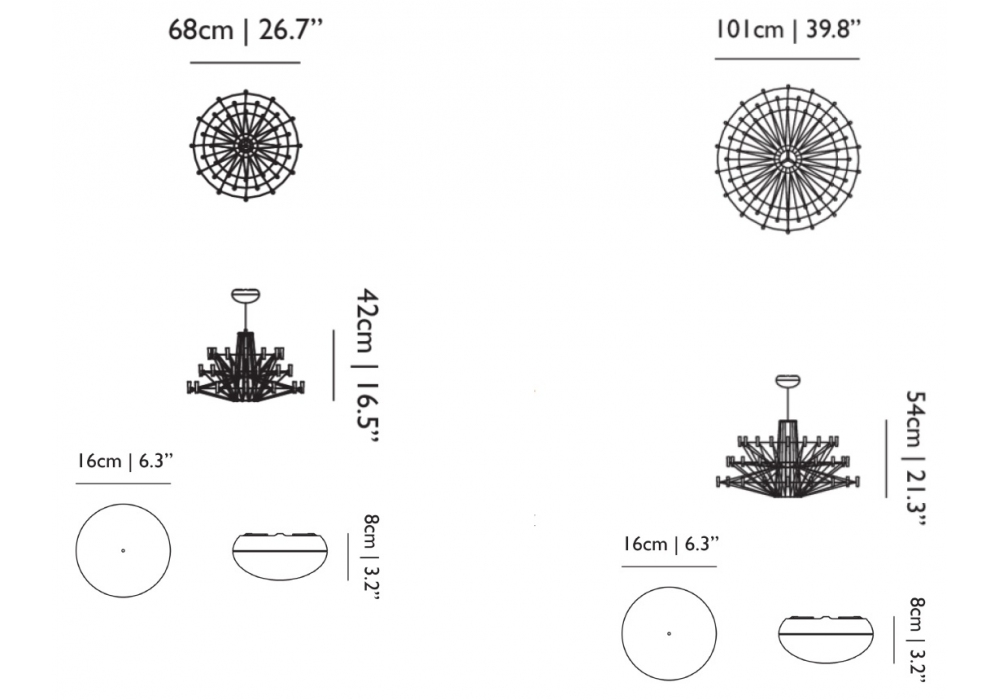 | Leuchtmittel | ø 68 cm x H 42 cm (36 LED - 2700 K - Max 28W - 450 lm - CRI 88 ); ø 101 cm x H 54 cm (54 LED - 2700 K - Max 33W - 676 lm - CRI 88 ). |