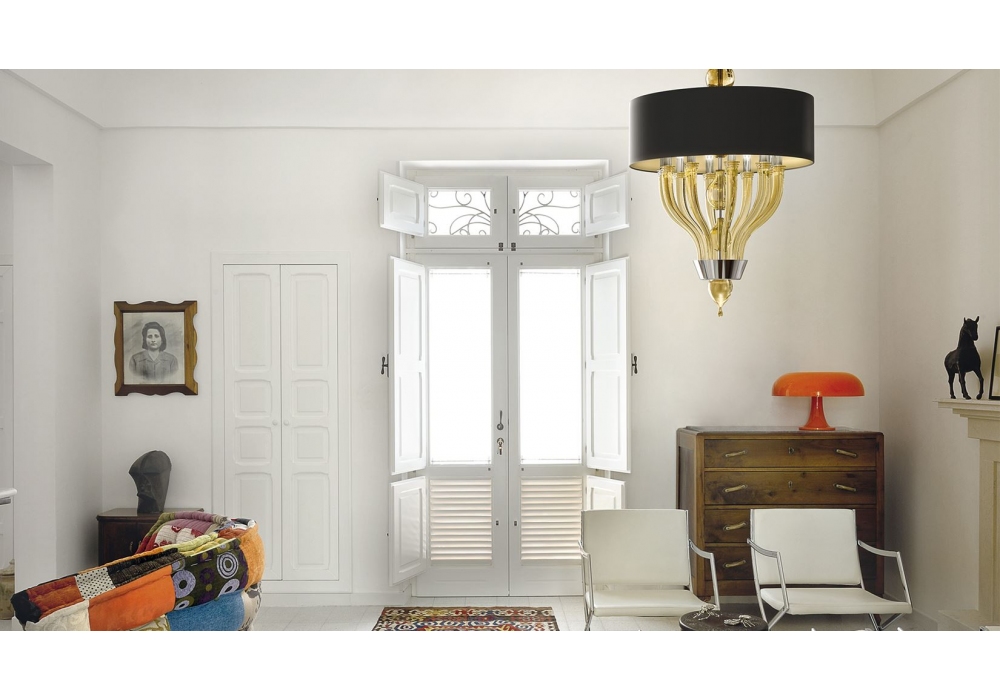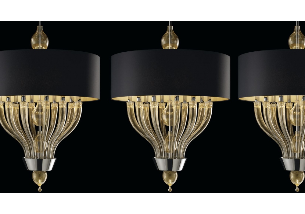 Pandora entworfen und hergestellt von Barovier & Toso ist eine Hängeleuchte mit tragender Struktur und Details aus Metall und Lampenkörper, der mit venezianischem Glas überzogen ist. Der Diffusor hat eine zylindrische Form aus Stoff und schirmt die dimmbaren LED- oder Halogenlichtquellen ab. Pandora ist in verschiedenen Modellen und Ausführungen erhältlich.