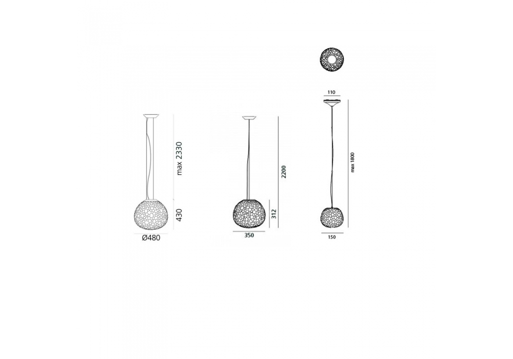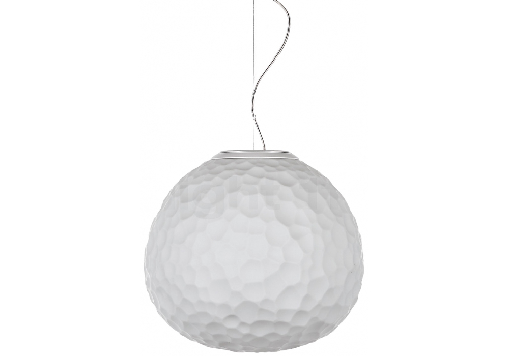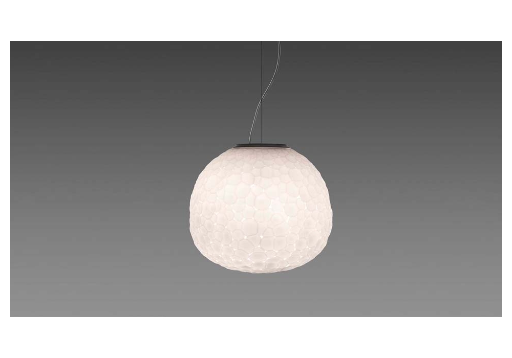 Meteorite von Pio & Tito Toso für Artemide entworfen ist eine Hängeleuchte mit tragender Struktur aus Technopolymer und Stahl. Der Diffusor ist kugelförmig, besteht aus mundgeblasenem Glas und beherbergt eine dimmbare LED-Lichtquelle. Meteorit ist in verschiedenen Größen erhältlich.