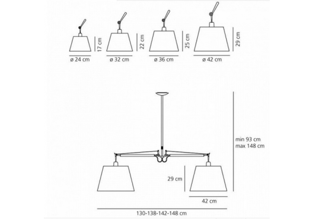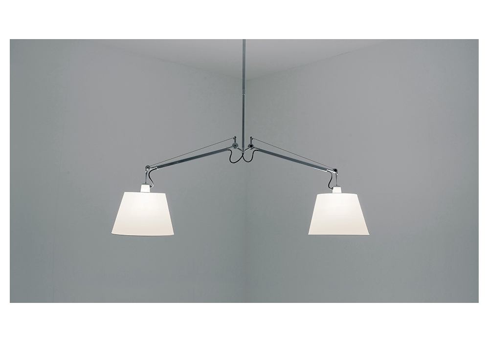 Tolomeo Basculante entworfen von Michele De Lucchi & Giancarlo Fassina für Artemide ist eine Hängeleuchte. Die Struktur besteht aus zwei beweglichen Armen aus poliertem Aluminium mit Gelenken aus poliertem Aluminium. Die Lampenschirme sind kreisförmig und beschirmen eine LED-Lichtquelle mit dimmbarem System. Tolomeo Basculante ist in verschiedenen Größen und Lampenschirmausführungen erhältlich.