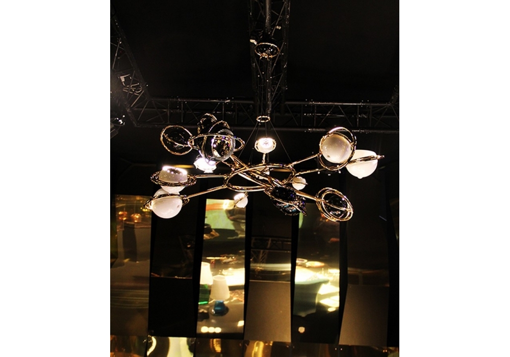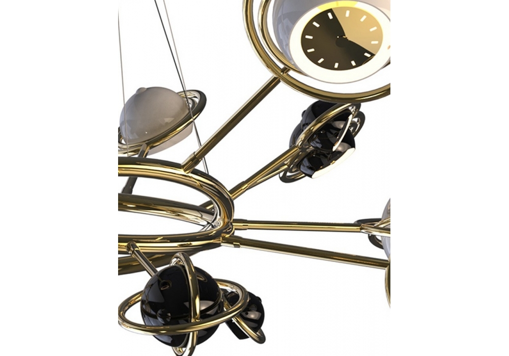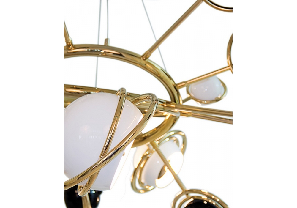 Cosmo, entworfen von DelightFULL, ist eine handgefertigte Pendelleuchte aus Messing und Stahl, der Körper ist mit einer vergoldeten Oberfläche überzogen, während die Lampenschirme aus Edelstahl außen glänzend schwarz und glänzend weiß lackiert sind.