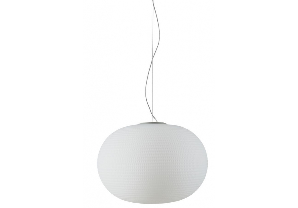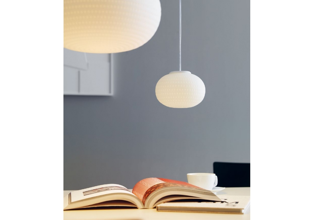 Bianca von Matti Klenell für Fontana Arte entworfen, ist eine Hängeleuchte mit diffusem, dimmbarem Licht mit Diffusor aus milchweißem, noch geblasenem und satiniertem Overlay-Glas. Aufhängekabel aus Stahl. Transparentes Stromkabel. Baldachin aus lackiertem Polycarbonat. Verfügbar in verschiedenen Abmessungen.